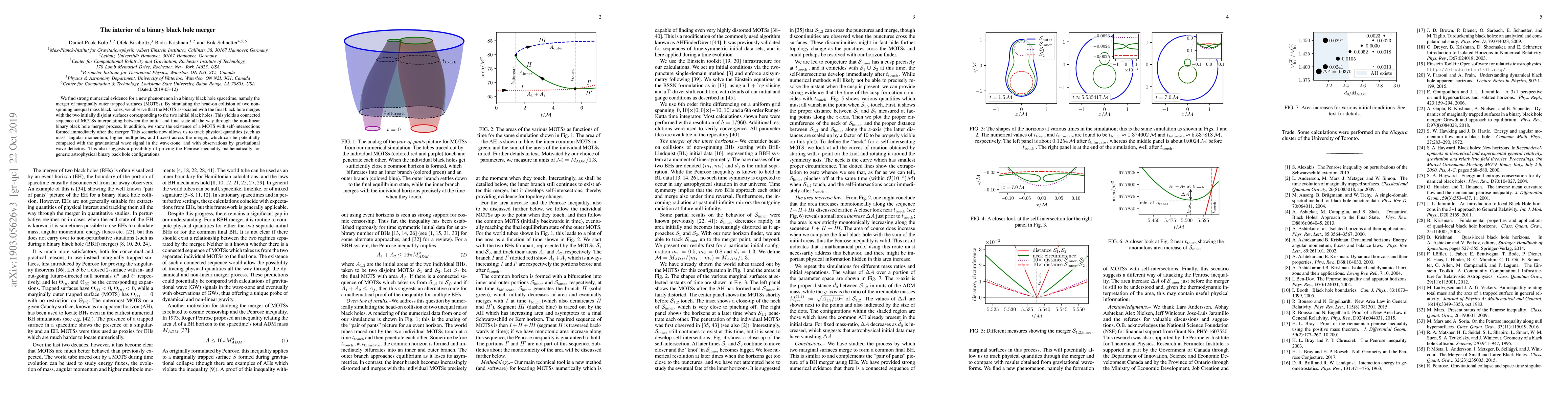 We find strong numerical evidence for a new phenomenon in a binary black hole spacetime, namely the merger of marginally outer trapped surfaces (MOTSs). By simulating the head-on collision of two non-spinning unequal mass black holes, we observe that the MOTS associated with the final black hole merges with the two initially disjoint surfaces corresponding to the two initial black holes. This yields a connected sequence of MOTSs interpolating between the initial and final state all the way through the non-linear binary black hole merger process. In addition, we show the existence of a MOTS with self-intersections formed immediately after the merger. This scenario now allows us to track physical quantities (such as mass, angular momentum, higher multipoles, and fluxes) across the merger, which can be potentially compared with the gravitational wave signal in the wave-zone, and with observations by gravitational wave detectors. This also suggests a possibility of proving the Penrose inequality mathematically for generic astrophysical binary back hole configurations.