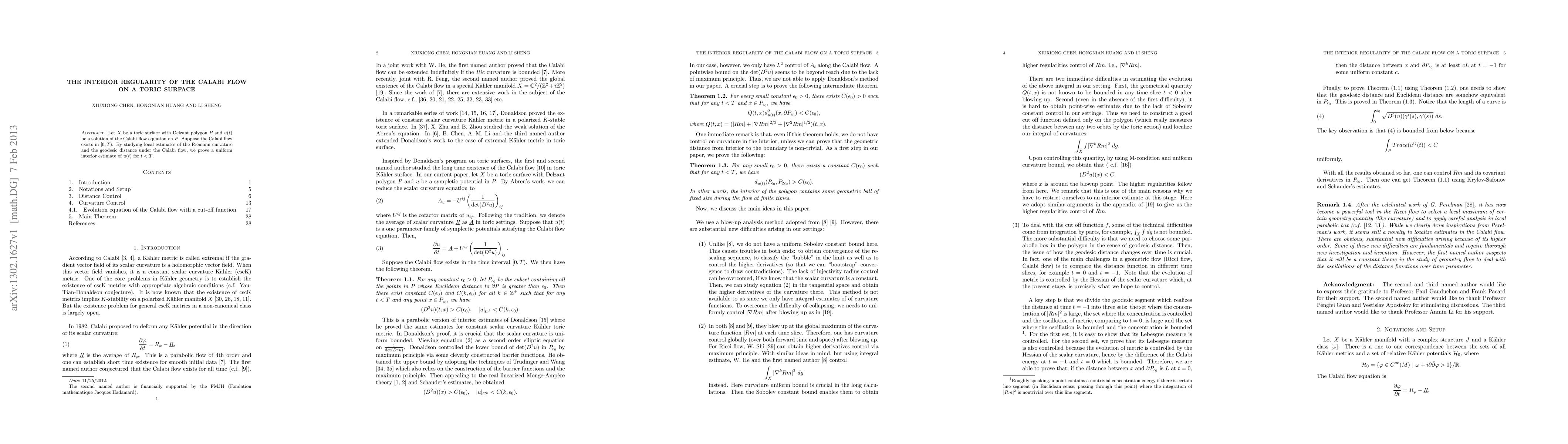 Let X be a toric surface with Delzant polygon P and u(t) be a solution of the Calabi flow equation on P. Suppose the Calabi flow exists in [0, T). By studying local estimates of the Riemann curvature and the geodesic distance under the Calabi flow, we prove a uniform interior estimate of u(t) for t < T.