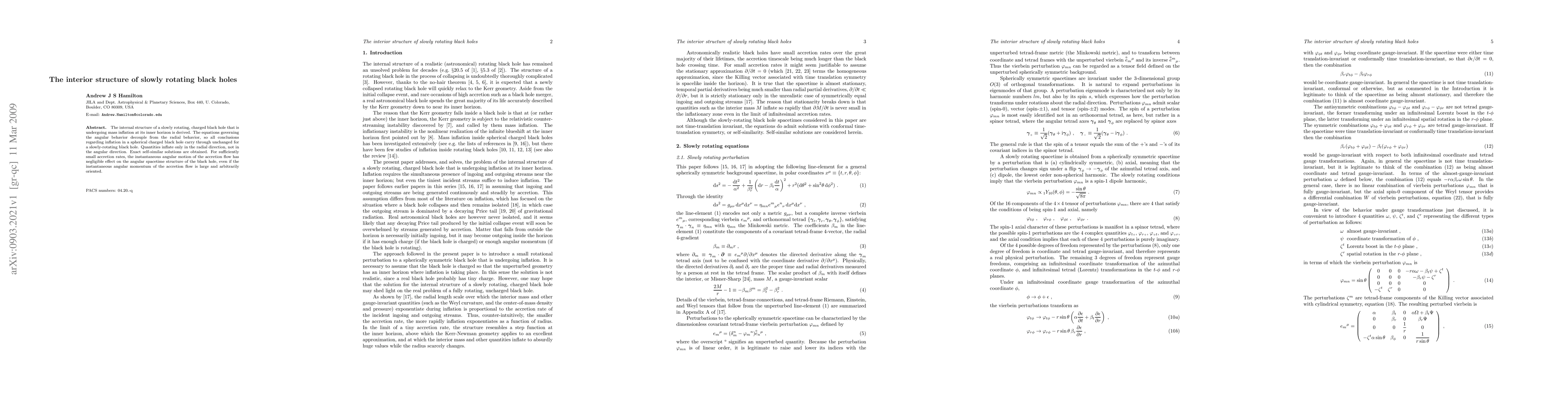 This paper derives the internal structure of slowly rotating, charged black holes undergoing mass inflation, showing that the angular behavior decouples from the radial behavior. Exact self-similar solutions reveal that inflation occurs only in the radial direction, with negligible angular effects from accretion flow, regardless of its angular momentum.