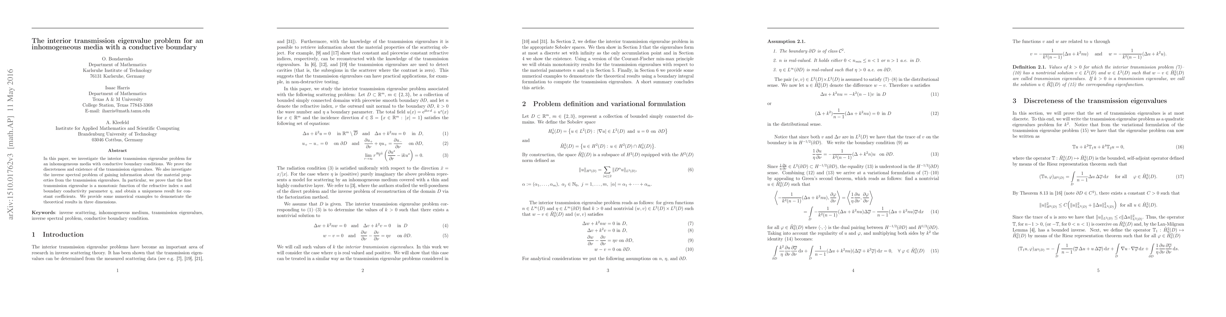 This paper explores the interior transmission eigenvalue problem in inhomogeneous media with conductive boundaries, proving the discreteness and existence of transmission eigenvalues. It also investigates the inverse spectral problem and demonstrates that the first transmission eigenvalue is monotonic in the refractive index and boundary conductivity, providing a uniqueness result for constant coefficients.