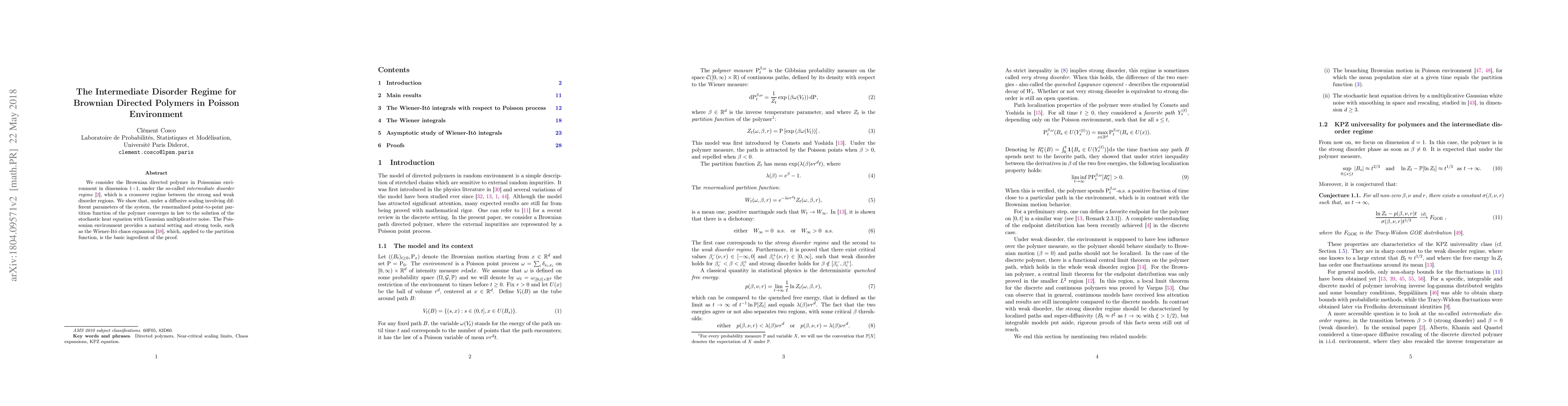 This paper investigates the Brownian directed polymer in a 1+1 dimensional Poissonian environment under intermediate disorder, demonstrating that the renormalized partition function converges to a stochastic heat equation with Gaussian multiplicative noise under diffusive scaling. The study leverages the Wiener-Ito chaos expansion to facilitate the proof.