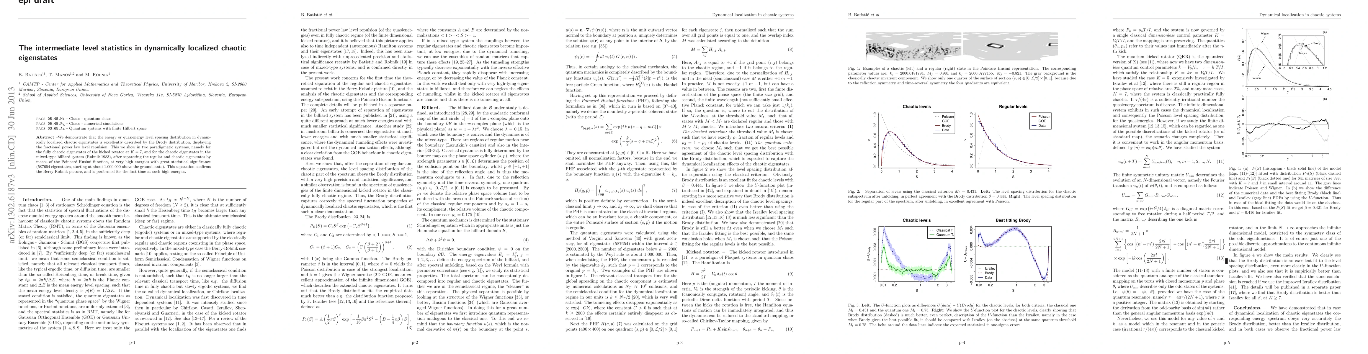 This paper demonstrates that the Brody distribution accurately describes the level spacing distribution in dynamically localized chaotic eigenstates, showing fractional power law level repulsion. It confirms this finding in two systems—the kicked rotator and the mixed-type billiard system—at very high energies, supporting the Berry-Robnik picture.