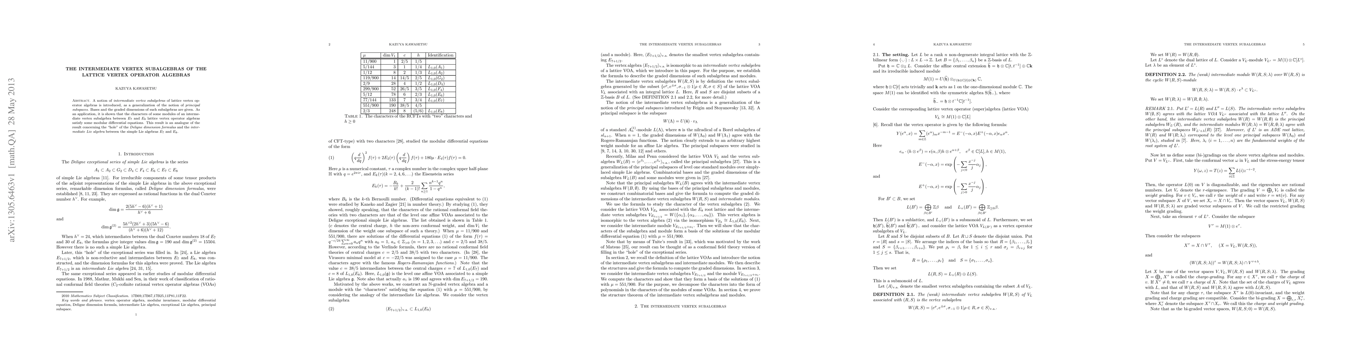 A notion of intermediate vertex subalgebras of lattice vertex operator algebras is introduced, as a generalization of the notion of principal subspaces. Bases and the graded dimensions of such subalgebras are given.As an application, it is shown that the characters of some modules of an intermediate vertex subalgebra between $E_7$ and $E_8$ lattice vertex operator algebras satisfy some modular differential equations.This result is an analogue of the result concerning the "hole" of the Deligne dimension formulas and the intermediate Lie algebra between the simple Lie algebras $E_7$ and $E_8$.