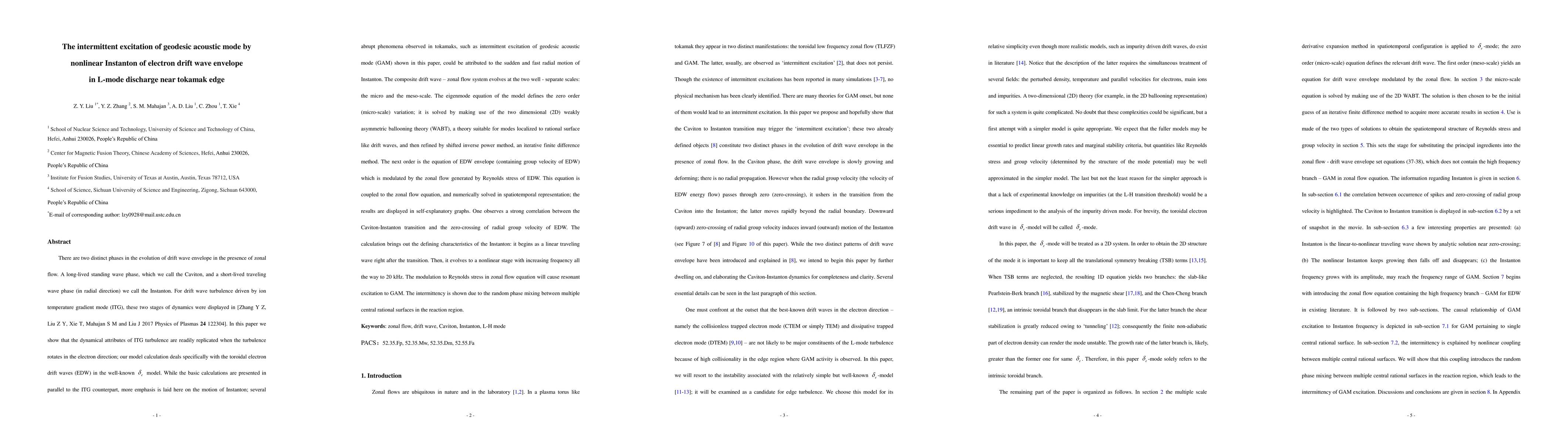 There are two distinct phases in the evolution of drift wave envelope in the presence of zonal flow. A long-lived standing wave phase, which we call the Caviton, and a short-lived traveling wave phase (in radial direction) we call the Instanton. For drift wave turbulence driven by ion temperature gradient mode (ITG), these two stages of dynamics were displayed in [Zhang Y Z, Liu Z Y, Xie T, Mahajan S M and Liu J 2017 Physics of Plasmas 24 122304]. In this paper we show that the dynamical attributes of ITG turbulence are readily replicated when the turbulence rotates in the electron direction; our model calculation deals specifically with the toroidal electron drift waves (EDW) in the well-known \delta_e model. While the basic calculations are presented in parallel to the ITG counterpart, more emphasis is laid here on the motion of Instanton; several abrupt phenomena observed in tokamaks, such as intermittent excitation of geodesic acoustic mode (GAM) shown in this paper, could be attributed to the sudden and fast radial motion of Instanton. The calculation brings out the defining characteristics of the Instanton: it begins as a linear traveling wave right after the transition. Then, it evolves to a nonlinear stage with increasing frequency all the way to 20 kHz. The modulation to Reynolds stress in zonal flow equation will cause resonant excitation to GAM. The intermittency is shown due to the random phase mixing between multiple central rational surfaces in the reaction region.