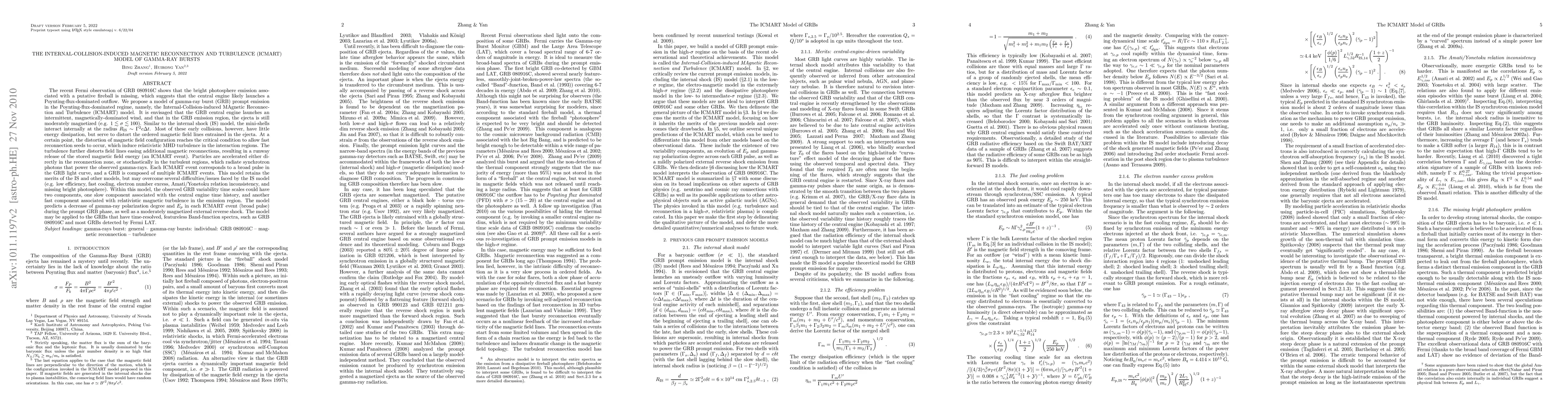 The ICMART model proposes that gamma-ray bursts (GRBs) originate from magnetic reconnection and turbulence in Poynting-flux-dominated outflows, driven by internal collisions in moderately magnetized ejecta, explaining the observed gamma-rays and addressing issues with the internal shock model.