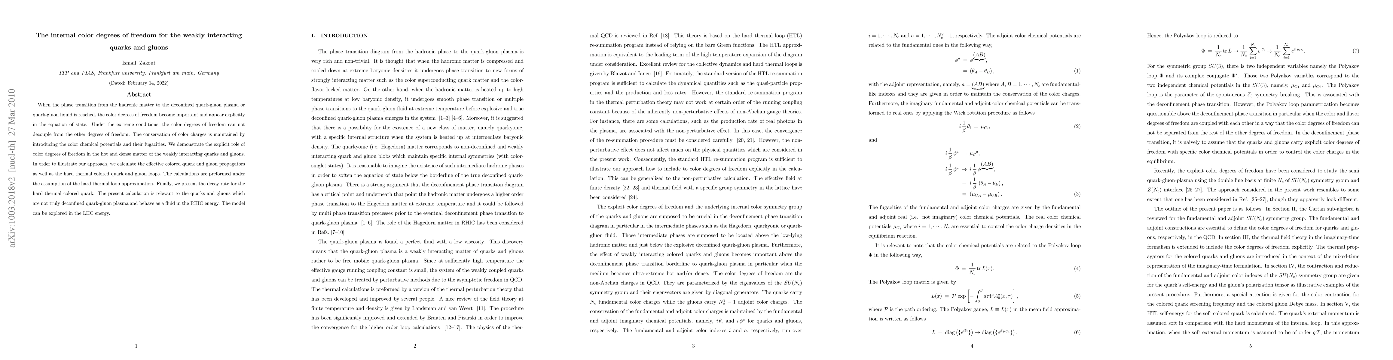 When the phase transition from the hadronic matter to the deconfined quark-gluon plasma or quark-gluon liquid is reached, the color degrees of freedom become important and appear explicitly in the equation of state. Under the extreme conditions, the color degrees of freedom can not decouple from the other degrees of freedom. The conservation of color charges is maintained by introducing the color chemical potentials and their fugacities. We demonstrate the explicit role of color degrees of freedom in the hot and dense matter of the weakly interacting quarks and gluons. In order to illustrate our approach, we calculate the effective colored quark and gluon propagators as well as the hard thermal colored quark and gluon loops. The calculations are preformed under the assumption of the hard thermal loop approximation. Finally, we present the decay rate for the hard thermal colored quark. The present calculation is relevant to the quarks and gluons which are not truly deconfined quark-gluon plasma and behave as a fluid in the RHIC energy. The model can be explored in the LHC energy.