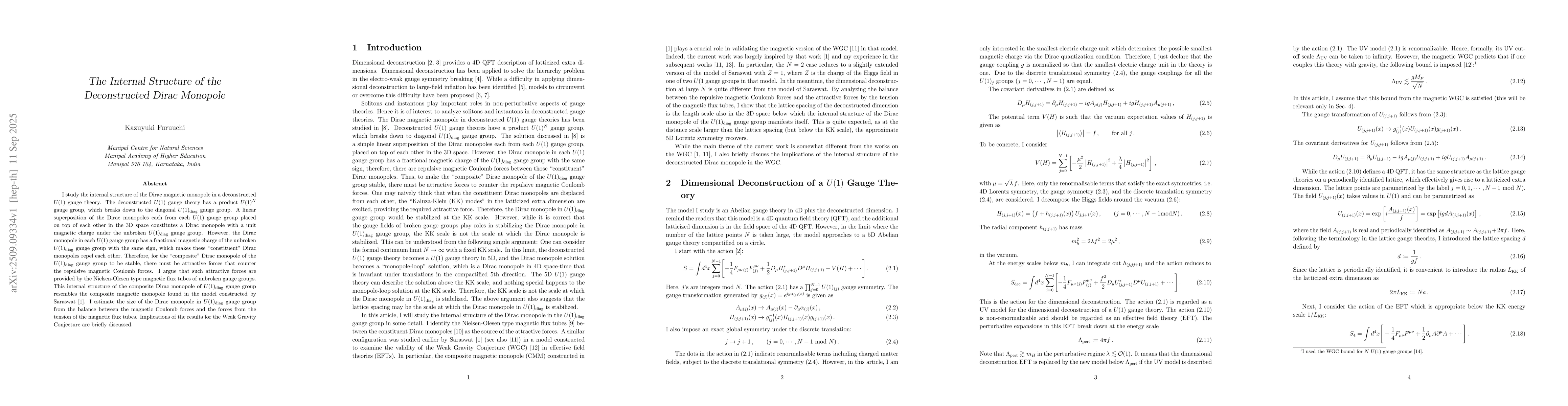 I study the internal structure of the Dirac magnetic monopole in a deconstructed $U(1)$ gauge theory. The deconstructed $U(1)$ gauge theory has a product $U(1)^N$ gauge group, which breaks down to the diagonal $U(1)_{\mathrm{diag}}$ gauge group. A linear superposition of the Dirac monopoles each from each $U(1)$ gauge group placed on top of each other in the 3D space constitutes a Dirac monopole with a unit magnetic charge under the unbroken $U(1)_{\mathrm{diag}}$ gauge group. However, the Dirac monopole in each $U(1)$ gauge group has a fractional magnetic charge of the unbroken $U(1)_{\mathrm{diag}}$ gauge group with the same sign, which makes these ``constituent'' Dirac monopoles repel each other. Therefore, for the ``composite'' Dirac monopole of the $U(1)_{\mathrm{diag}}$ gauge group to be stable, there must be attractive forces that counter the repulsive magnetic Coulomb forces. I argue that such attractive forces are provided by the Nielsen-Olesen type magnetic flux tubes of unbroken gauge groups. This internal structure of the composite Dirac monopole of $U(1)_{\mathrm{diag}}$ gauge group resembles the composite magnetic monopole found in the model constructed by Saraswat arXiv:1608.06951. I estimate the size of the Dirac monopole in $U(1)_{\mathrm{diag}}$ gauge group from the balance between the magnetic Coulomb forces and the forces from the tension of the magnetic flux tubes. Implications of the results for the Weak Gravity Conjecture are briefly discussed.