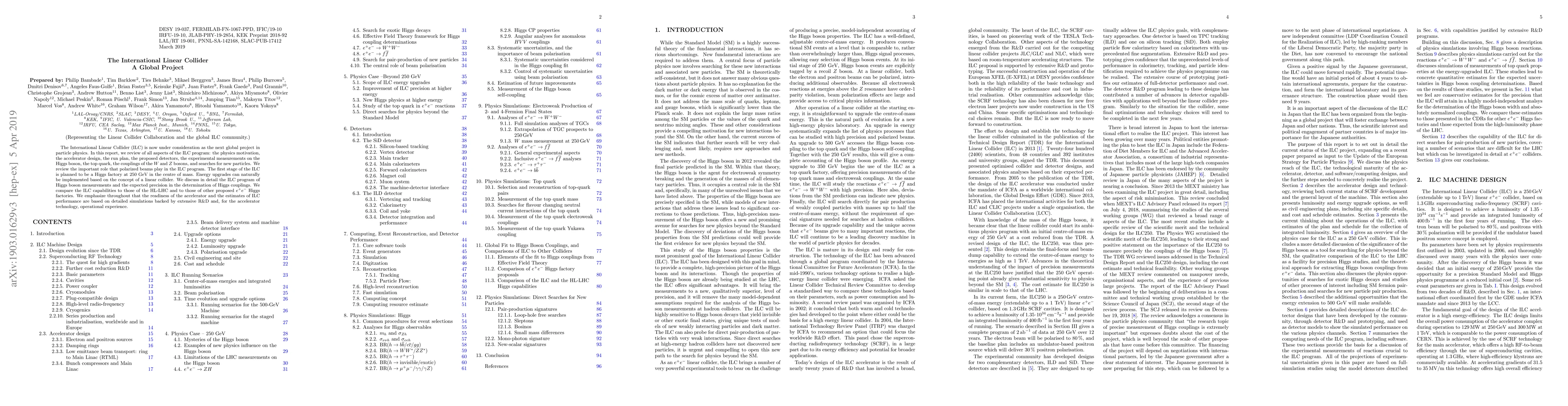 The International Linear Collider (ILC) is now under consideration as the next global project in particle physics. In this report, we review of all aspects of the ILC program: the physics motivation, the accelerator design, the run plan, the proposed detectors, the experimental measurements on the Higgs boson, the top quark, the couplings of the W and Z bosons, and searches for new particles. We review the important role that polarized beams play in the ILC program. The first stage of the ILC is planned to be a Higgs factory at 250 GeV in the centre of mass. Energy upgrades can naturally be implemented based on the concept of a linear collider. We discuss in detail the ILC program of Higgs boson measurements and the expected precision in the determination of Higgs couplings. We compare the ILC capabilities to those of the HL-LHC and to those of other proposed e+e- Higgs factories. We emphasize throughout that the readiness of the accelerator and the estimates of ILC performance are based on detailed simulations backed by extensive RandD and, for the accelerator technology, operational experience.