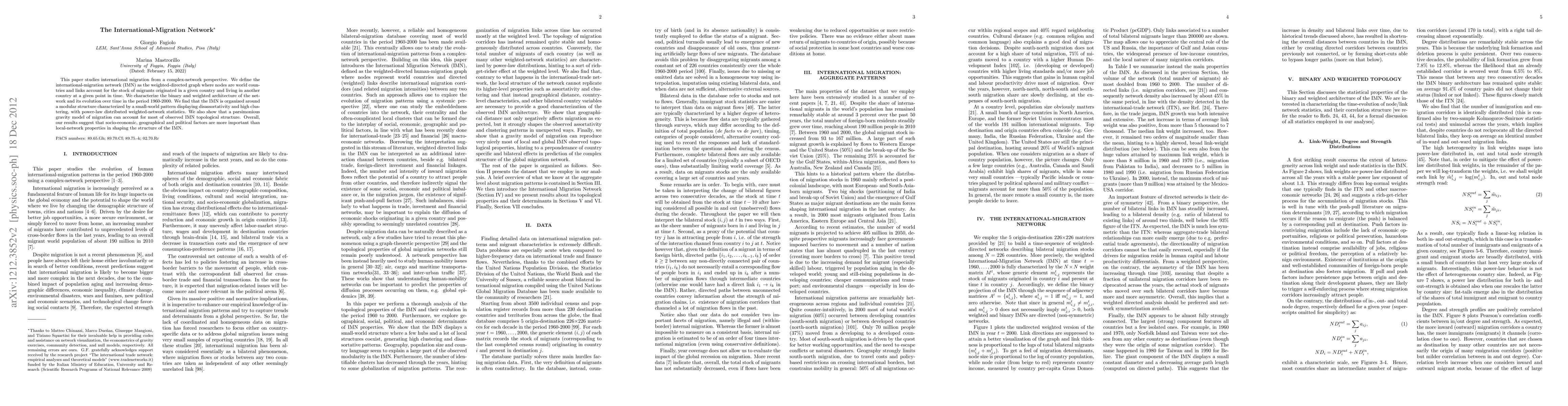 This paper examines international migration from a complex-network perspective, revealing a modular, small-world structure in the international-migration network (IMN) from 1960-2000. A gravity model of migration explains most of the observed network's topological features, indicating that socio-economic, geographical, and political factors significantly influence its formation.