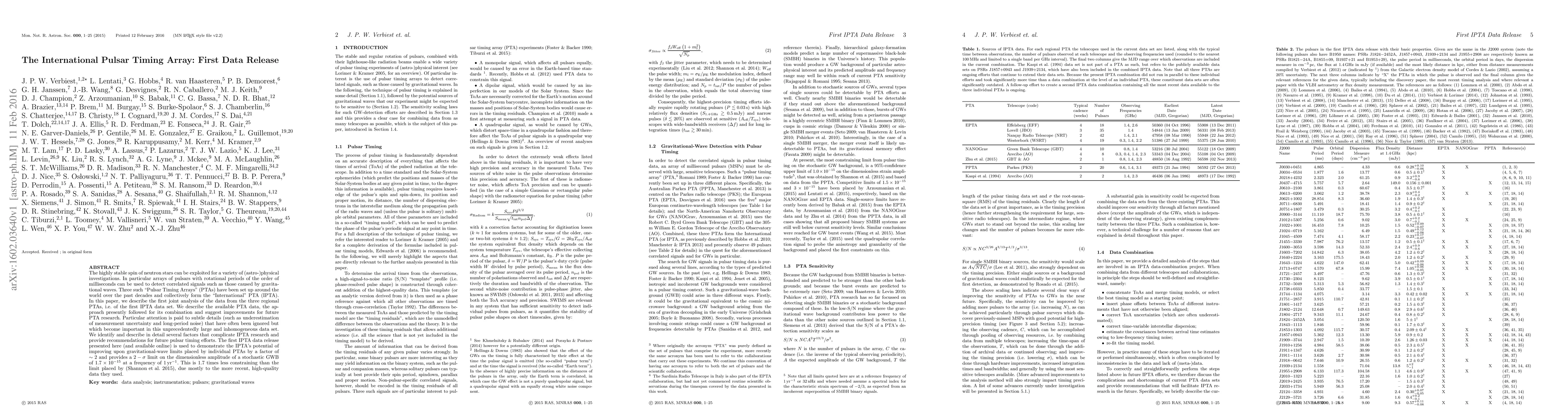 The highly stable spin of neutron stars can be exploited for a variety of (astro-)physical investigations. In particular arrays of pulsars with rotational periods of the order of milliseconds can be used to detect correlated signals such as those caused by gravitational waves. Three such "Pulsar Timing Arrays" (PTAs) have been set up around the world over the past decades and collectively form the "International" PTA (IPTA). In this paper, we describe the first joint analysis of the data from the three regional PTAs, i.e. of the first IPTA data set. We describe the available PTA data, the approach presently followed for its combination and suggest improvements for future PTA research. Particular attention is paid to subtle details (such as underestimation of measurement uncertainty and long-period noise) that have often been ignored but which become important in this unprecedentedly large and inhomogeneous data set. We identify and describe in detail several factors that complicate IPTA research and provide recommendations for future pulsar timing efforts. The first IPTA data release presented here (and available online) is used to demonstrate the IPTA's potential of improving upon gravitational-wave limits placed by individual PTAs by a factor of ~2 and provides a 2-sigma limit on the dimensionless amplitude of a stochastic GWB of 1.7x10^{-15} at a frequency of 1 yr^{-1}. This is 1.7 times less constraining than the limit placed by (Shannon et al. 2015), due mostly to the more recent, high-quality data they used.