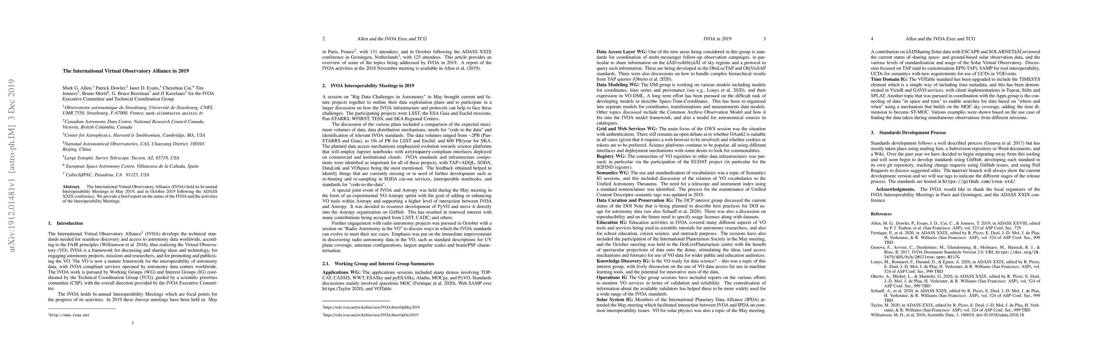 The International Virtual Observatory Alliance (IVOA) held two Interoperability Meetings in 2019, reporting on the progress and activities aimed at enhancing data interoperability across global astronomy databases. The meetings focused on advancing collaborative efforts and technological standards within the field.