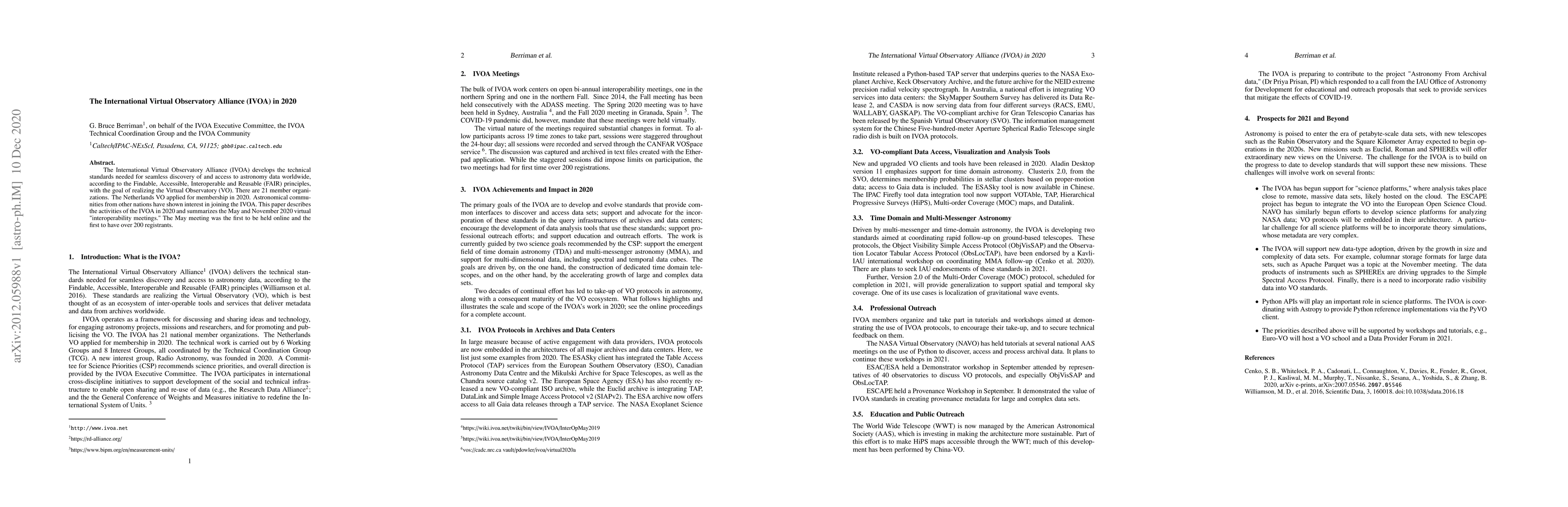 The International Virtual Observatory Alliance (IVOA) in 2020 focused on developing technical standards for global astronomy data access based on FAIR principles, with 21 member organizations and growing interest in membership. The May 2020 virtual "interoperability meeting" was the first online event with over 200 registrants.