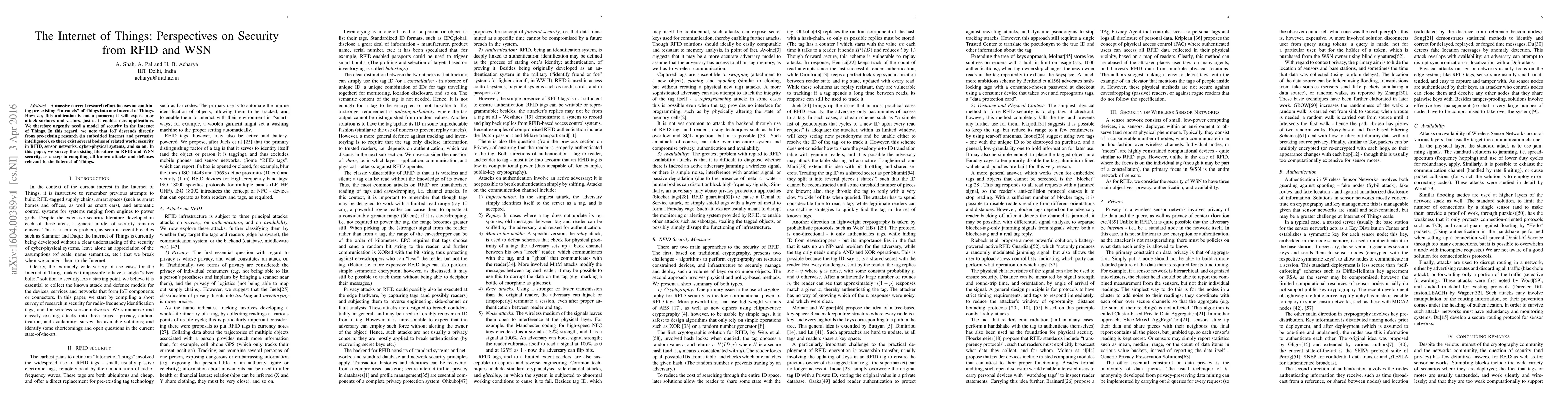 A massive current research effort focuses on combining pre-existing 'Intranets' of Things into one Internet of Things. However, this unification is not a panacea; it will expose new attack surfaces and vectors, just as it enables new applications. We therefore urgently need a model of security in the Internet of Things. In this regard, we note that IoT descends directly from pre-existing research (in embedded Internet and pervasive intelligence), so there exist several bodies of related work: security in RFID, sensor networks, cyber-physical systems, and so on. In this paper, we survey the existing literature on RFID and WSN security, as a step to compiling all known attacks and defenses relevant to the Internet of Things.