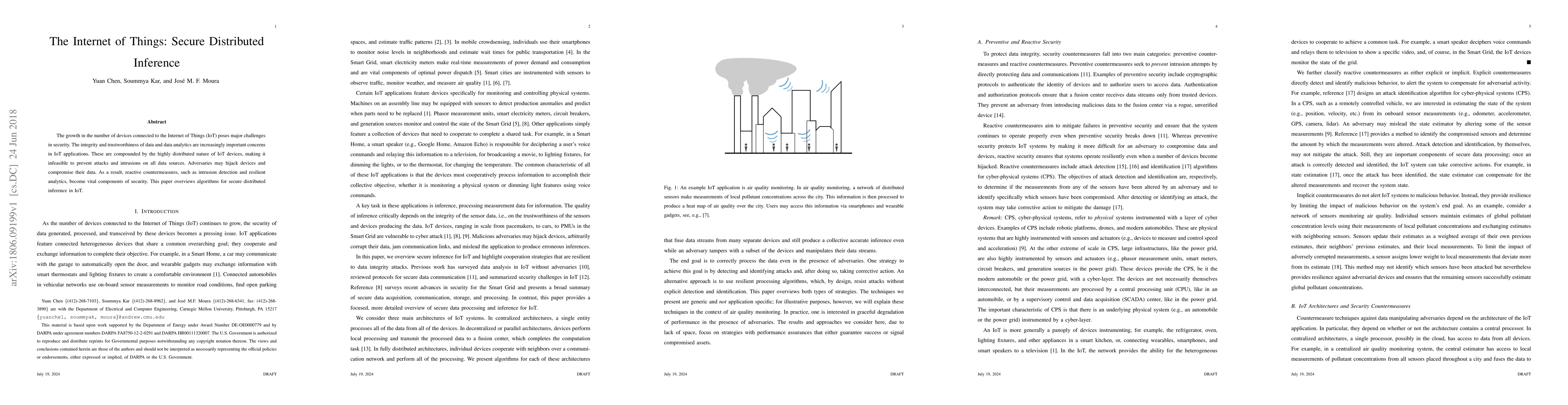 This paper discusses the security challenges posed by the proliferation of IoT devices, emphasizing the importance of secure data analytics and the need for reactive measures like intrusion detection. It provides an overview of algorithms for secure distributed inference to address these security concerns.