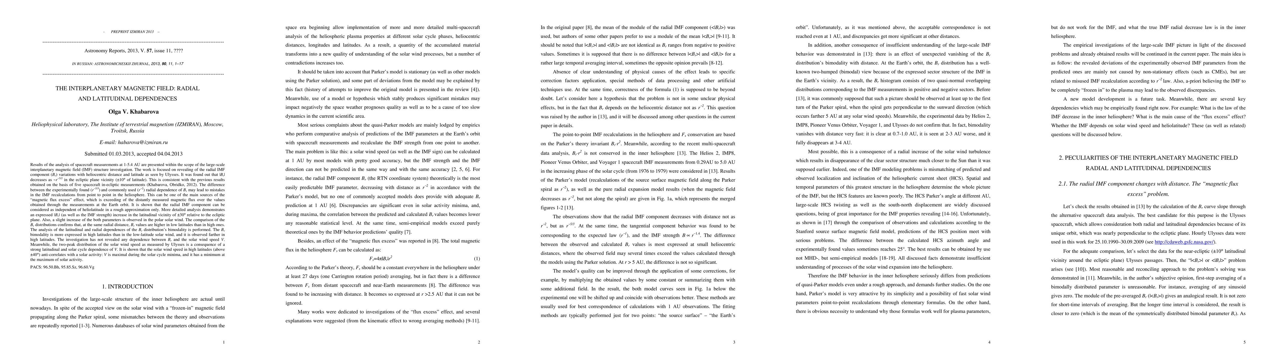 Results of the analysis of spacecraft measurements at 1-5.4 AU are presented within the scope of the large-scale interplanetary magnetic field (IMF) structure investigation. The work is focused on revealing of the radial IMF component (Br) variations with heliocentric distance and latitude as seen by Ulysses. It was found out that |Br| decreases as ~r^-5/3 in the ecliptic plane vicinity (10 deg. of latitude). This is consistent with the previous results obtained on the basis of five spacecraft in-ecliptic measurements (Khabarova, Obridko, 2012). The difference between the experimentally found (r^-5/3) and commonly used (r^-2) radial dependence of Br may lead to mistakes in the IMF recalculations from point to point in the heliosphere. This can be one of the main sources of the 'magnetic flux excess' effect, which is exceeding of the distantly measured magnetic flux over the values obtained through the measurements at the Earth orbit. It is shown that the radial IMF component can be considered as independent of heliolatitude in a rough approximation only. More detailed analysis demonstrates an expressed |Br| (as well as the IMF strength) increase in the latitudinal vicinity of 30 deg. relative to the ecliptic plane. Also, a slight increase of the both parameters is observed in the polar solar wind. The analysis of the latitudinal and radial dependences of the Br distribution's bimodality is performed. The investigation has not revealed any dependence between Br and the solar wind speed V. Meanwhile, the two-peak distribution of the solar wind speed as measured by Ulysses is a consequence of a strong latitudinal and solar cycle dependence of V. It is shown that the solar wind speed in high latitudes (above 40 deg.) anti-correlates with a solar activity: V is maximal during the solar cycle minima, and it has a minimum at the maximum of solar activity.