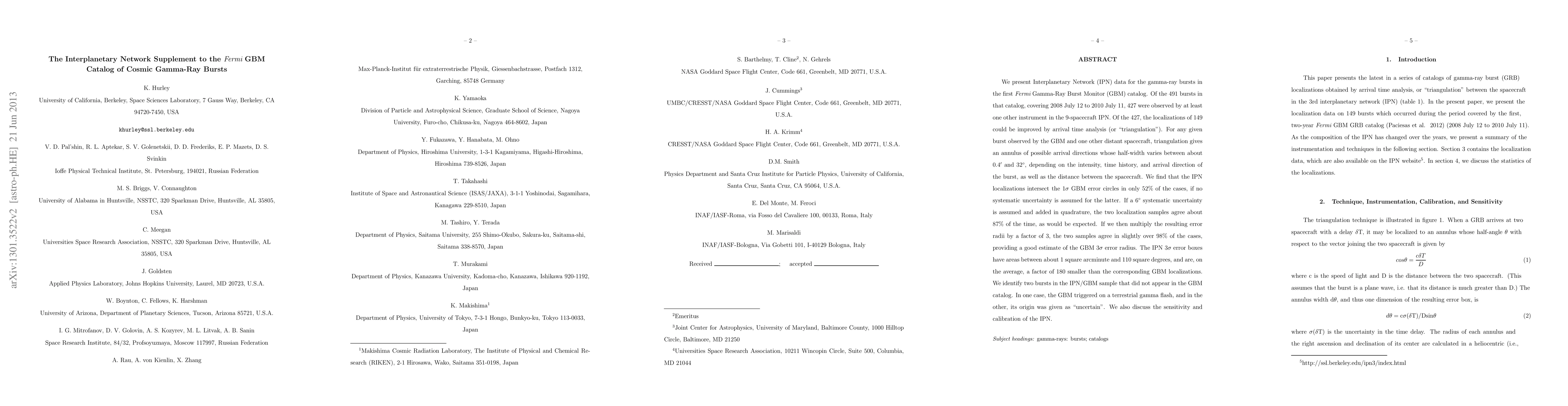 This paper presents Interplanetary Network (IPN) data for gamma-ray bursts in the Fermi GBM catalog, showing that IPN localizations improve the accuracy of GBM observations. The IPN's triangulation method reduces error boxes by a factor of 180 on average, and identifies two additional bursts not listed in the GBM catalog.