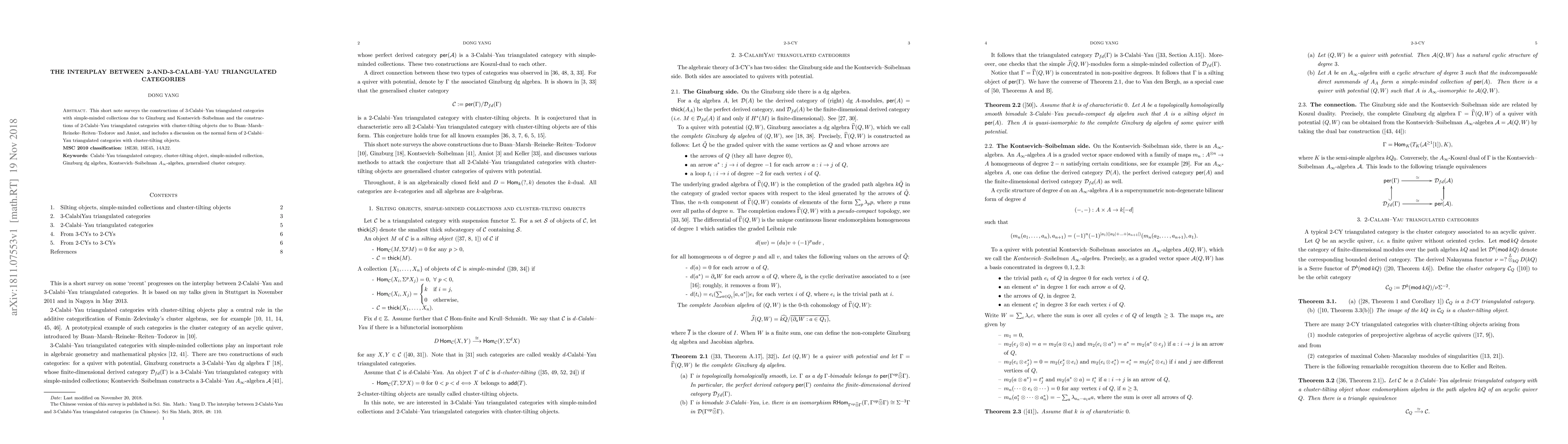 This short note surveys the constructions of 3-Calabi--Yau triangulated categories with simple-minded collections due to Ginzburg and Kontsevich--Soibelman and the constructions of 2-Calabi--Yau triangulated categories with cluster-tilting objects due to Buan--Marsh--Reineke--Reiten--Todorov and Amiot, and includes a discussion on the normal form of 2-Calabi--Yau triangulated categories with cluster-tilting objects.