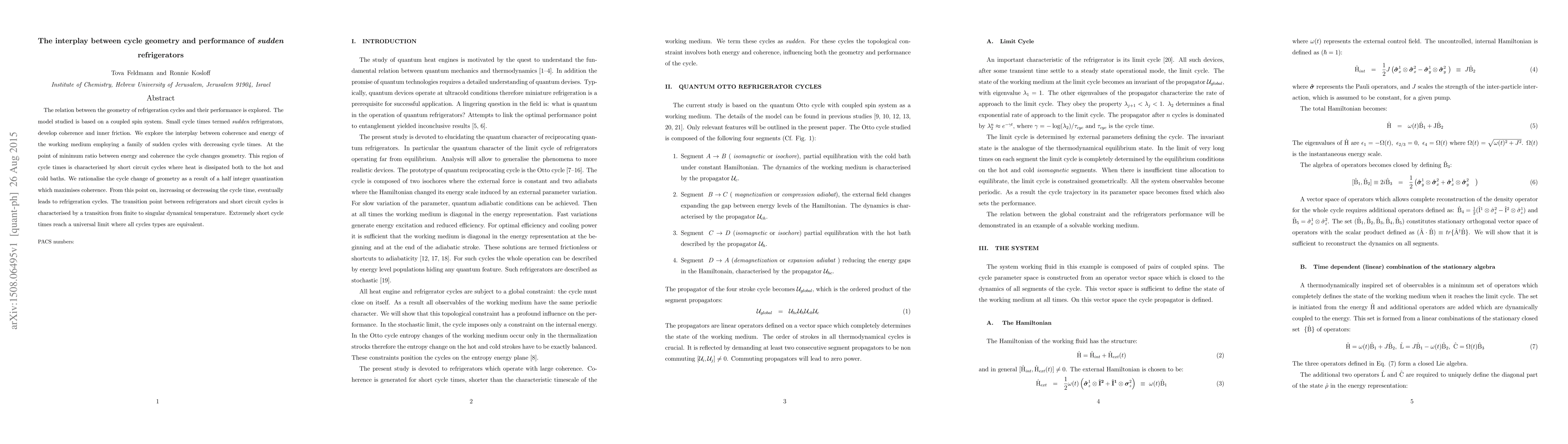 The relation between the geometry of refrigeration cycles and their performance is explored. The model studied is based on a coupled spin system. Small cycle times termed sudden refrigerators, develop coherence and inner friction. We explore the interplay between coherence and energy of the working medium employing a family of sudden cycles with decreasing cycle times. At the point of minimum ratio between energy and coherence the cycle changes geometry. This region of cycle times is characterised by short circuit cycles where heat is dissipated both to the hot and cold baths. We rationalise the cycle change of geometry as a result of a half integer quantisation which maximises coherence. From this point on, increasing or decreasing the cycle time, eventually leads to refrigeration cycles. The transition point between refrigerators and short circuit cycles is characterised by a transition from finite to singular dynamical temperature. Extremely short cycle times reach a universal limit where all cycles types are equivalent.