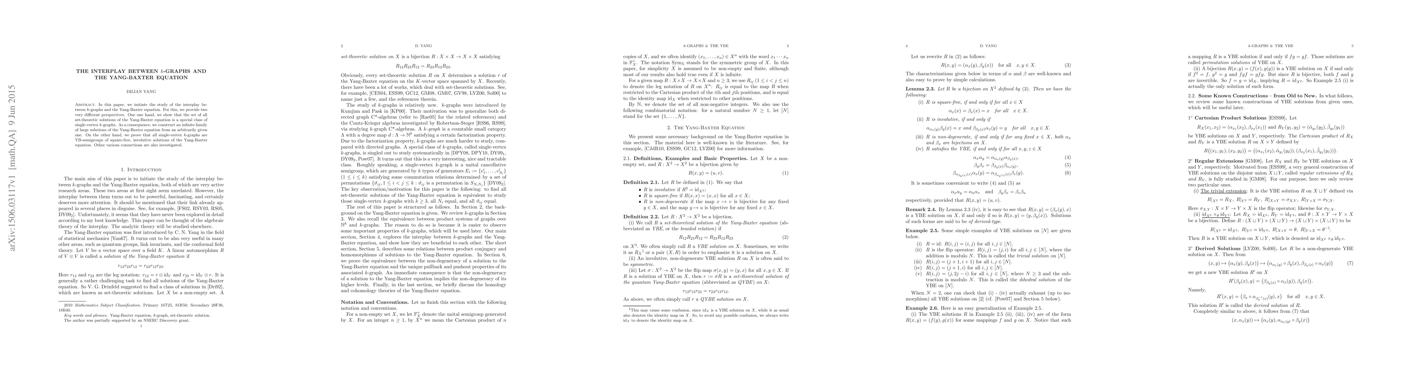 This paper explores the relationship between $k$-graphs and the Yang-Baxter equation, showing that set-theoretic solutions of the equation form a specific class of single-vertex $k$-graphs and proving that all such $k$-graphs are YB-semigroups of square-free, involutive solutions.