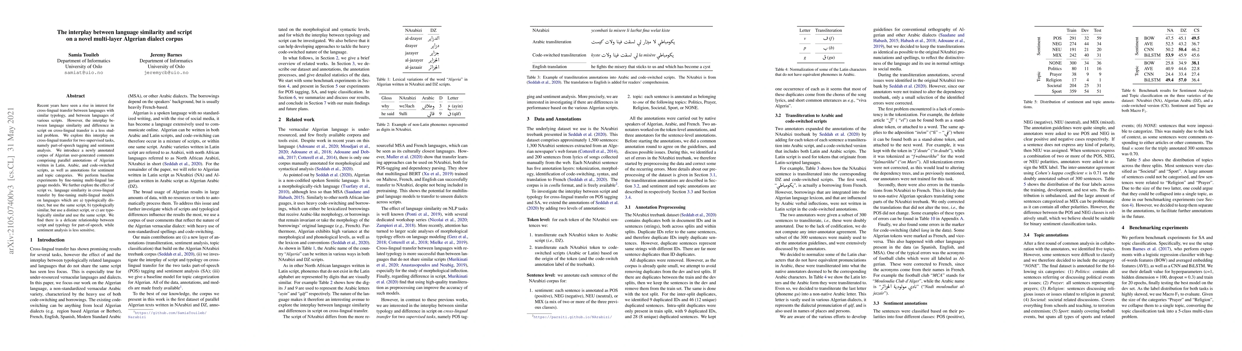 This paper investigates the interplay between language similarity and script differences in cross-lingual transfer, using a new multi-layer Algerian dialect corpus. Experiments reveal nuanced effects on part-of-speech tagging and less sensitivity in sentiment analysis, highlighting the complex relationship between script and typology.
