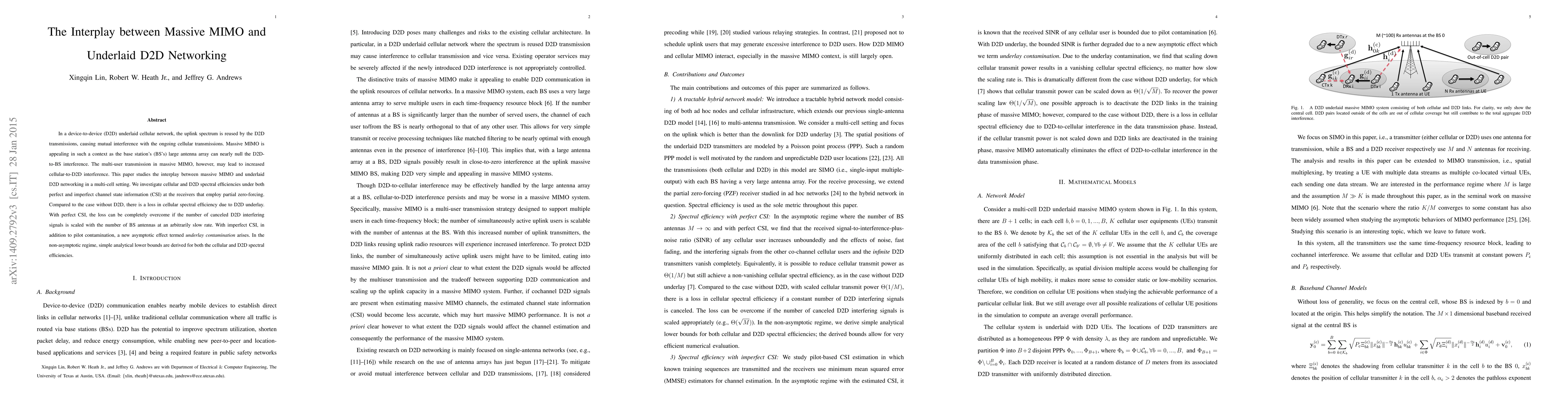 In a device-to-device (D2D) underlaid cellular network, the uplink spectrum is reused by the D2D transmissions, causing mutual interference with the ongoing cellular transmissions. Massive MIMO is appealing in such a context as the base station's (BS's) large antenna array can nearly null the D2D-to-BS interference. The multi-user transmission in massive MIMO, however, may lead to increased cellular-to-D2D interference. This paper studies the interplay between massive MIMO and underlaid D2D networking in a multi-cell setting. We investigate cellular and D2D spectral efficiency under both perfect and imperfect channel state information (CSI) at the receivers that employ partial zero-forcing. Compared to the case without D2D, there is a loss in cellular spectral efficiency due to D2D underlay. With perfect CSI, the loss can be completely overcome if the number of canceled D2D interfering signals is scaled with the number of BS antennas at an arbitrarily slow rate. With imperfect CSI, in addition to pilot contamination, a new asymptotic effect termed underlay contamination arises. In the non-asymptotic regime, simple analytical lower bounds are derived for both the cellular and D2D spectral efficiency.