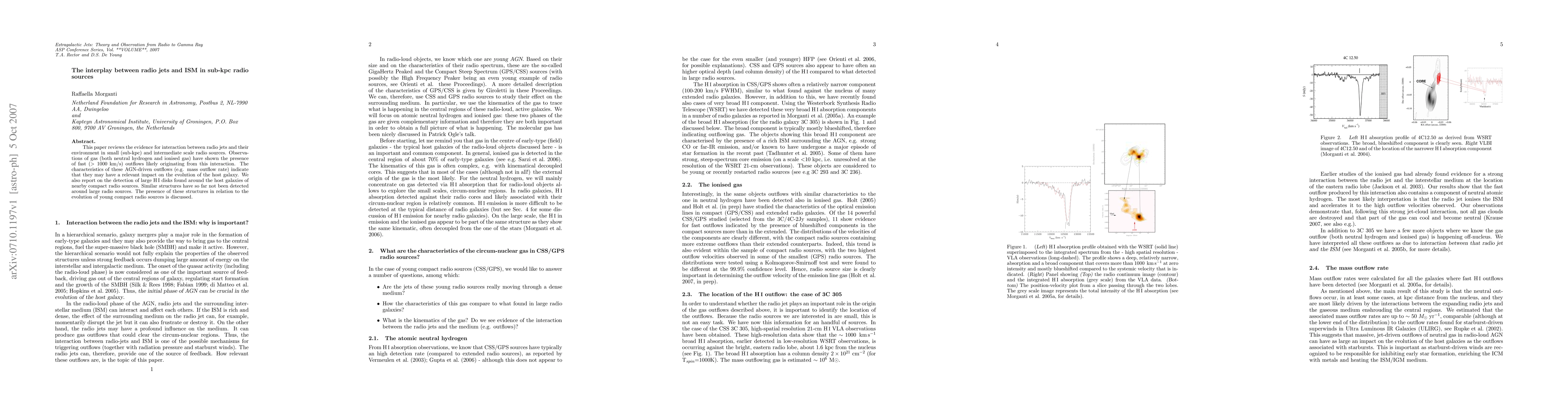 This paper reviews the evidence for interaction between radio jets and their environment in small and intermediate (sub-kpc) scale radio sources. Observations of gas (both neutral hydrogen and ionised gas) have shown the presence of fast (> 1000 km/s) outflows likely originating from this interaction. The characteristics of these AGN-driven outflows (e.g. mass outflow rate) indicate that they may have a relevant impact on the evolution of the host galaxy. We also report on the detection of large HI disks found around the host galaxies of nearby compact radio sources. Similar structures have so far not been detected around large radio sources. The presence of these structures in relation to the evolution of young compact radio sources is discussed.