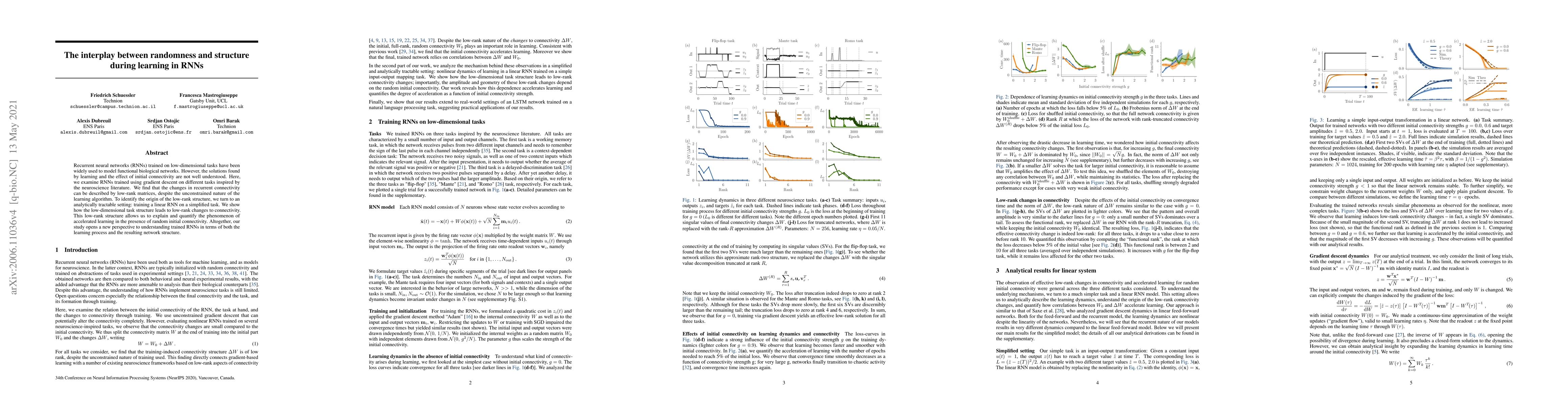 This paper explores how low-rank structures emerge in RNNs during training on low-dimensional tasks, revealing that initial random connectivity accelerates learning. The study uses gradient descent on neuroscience-inspired tasks and finds that the recurrent connectivity changes can be described by low-rank matrices, providing insights into both the learning process and network structure.