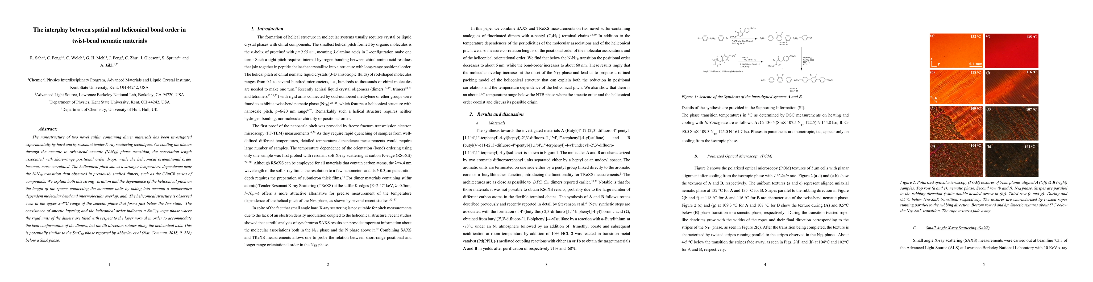 The nanostructure of two novel sulfur containing dimer materials has been investigated experimentally by hard and by resonant tender X-ray scattering techniques. On cooling the dimers through the nematic to twist-bend nematic (N-NTB) phase transition, the correlation length associated with short-range positional order drops, while the heliconical orientational order becomes more correlated. The heliconical pitch shows a stronger temperature dependence near the N-NTB transition than observed in previously studied dimers, such as the CBnCB series of compounds. We explain both this strong variation and the dependence of the heliconical pitch on the length of the spacer connecting the monomer units by taking into account a temperature dependent molecular bend and intermolecular overlap. and. The heliconical structure is observed even in the upper 3-4{\deg}C range of the smectic phase that forms just below the NTB state. The coexistence of smectic layering and the heliconical order indicates a SmCTB -type phase where the rigid units of the dimers are tilted with respect to the layer normal in order to accommodate the bent conformation of the dimers, but the tilt direction rotates along the heliconical axis. This is potentially similar to the SmCTB phase reported by Abberley et al (Nat. Commun. 2018, 9, 228) below a SmA phase.