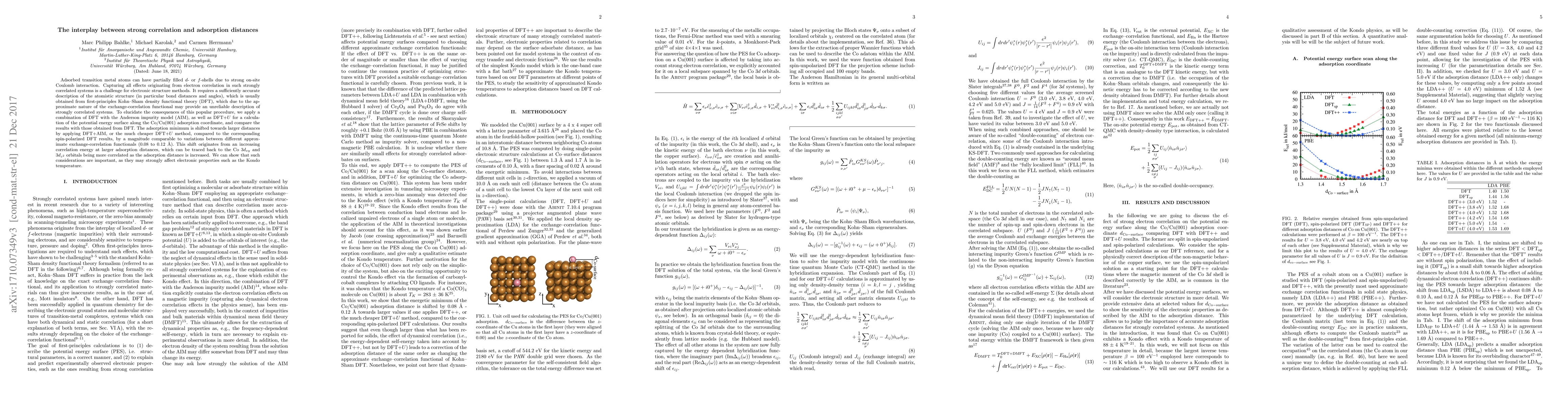 This research explores the impact of strong electron correlation on adsorption distances of transition metal atoms on Cu(001). By combining DFT with the Anderson Impurity Model (AIM) and DFT+U, the study reveals that adsorption minima shift to larger distances compared to standard DFT. This shift, around 0.08 to 0.12 Angstrom, results from increased correlation energy with greater adsorption distances, primarily affecting Co 3d_{xy} and 3d_{z2} orbitals.