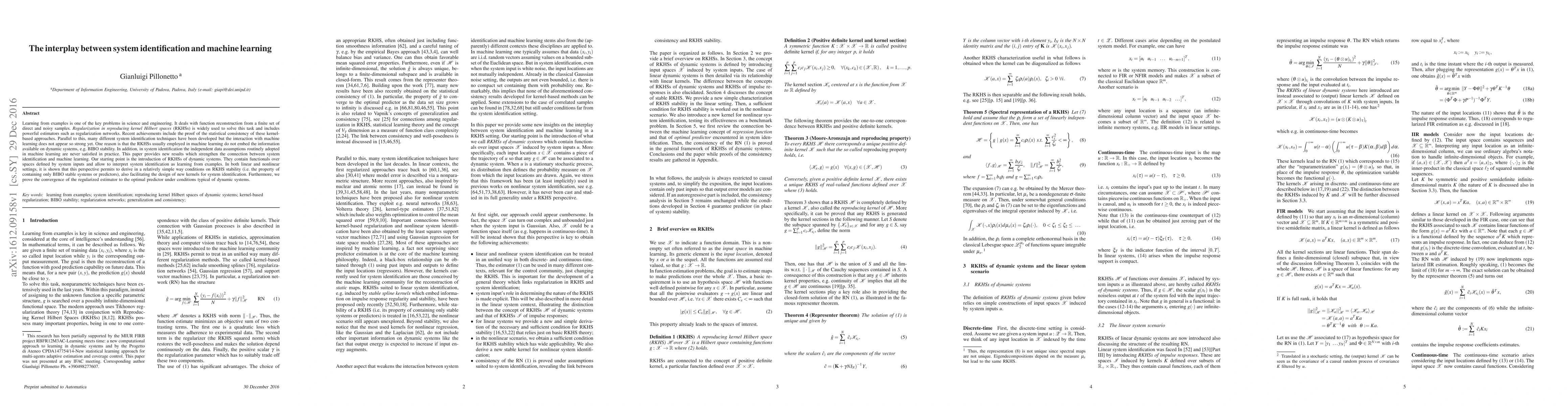 Learning from examples is one of the key problems in science and engineering. It deals with function reconstruction from a finite set of direct and noisy samples. Regularization in reproducing kernel Hilbert spaces (RKHSs) is widely used to solve this task and includes powerful estimators such as regularization networks. Recent achievements include the proof of the statistical consistency of these kernel- based approaches. Parallel to this, many different system identification techniques have been developed but the interaction with machine learning does not appear so strong yet. One reason is that the RKHSs usually employed in machine learning do not embed the information available on dynamic systems, e.g. BIBO stability. In addition, in system identification the independent data assumptions routinely adopted in machine learning are never satisfied in practice. This paper provides new results which strengthen the connection between system identification and machine learning. Our starting point is the introduction of RKHSs of dynamic systems. They contain functionals over spaces defined by system inputs and allow to interpret system identification as learning from examples. In both linear and nonlinear settings, it is shown that this perspective permits to derive in a relatively simple way conditions on RKHS stability (i.e. the property of containing only BIBO stable systems or predictors), also facilitating the design of new kernels for system identification. Furthermore, we prove the convergence of the regularized estimator to the optimal predictor under conditions typical of dynamic systems.