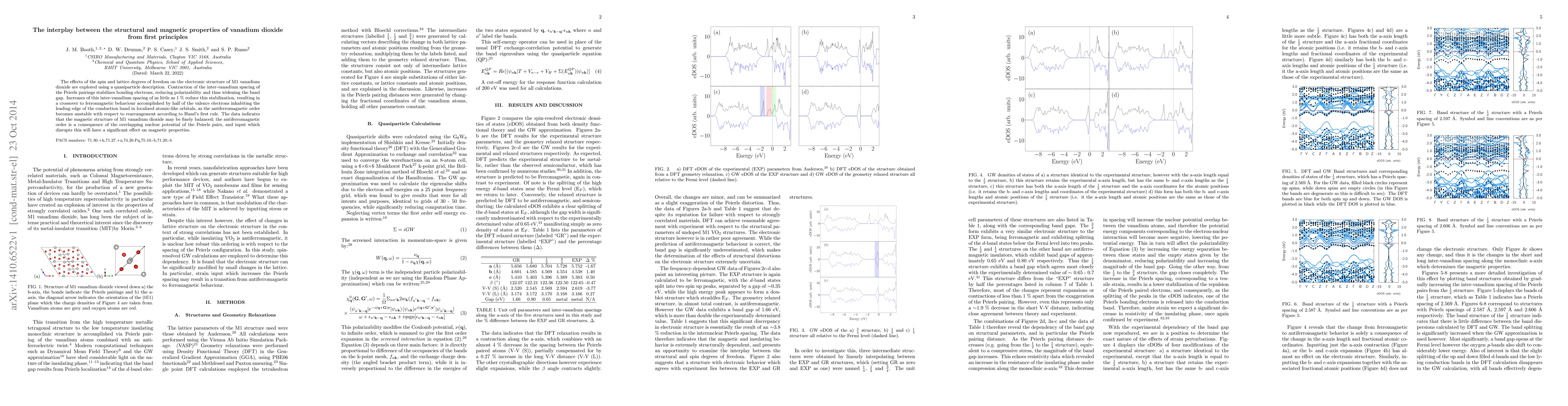 The effects of the spin and lattice degrees of freedom on the electronic structure of M1 vanadium dioxide are explored using a quasiparticle description. Contraction of the inter-vanadium spacing of the Peierls pairings stabilizes bonding electrons, reducing polarizability and thus widening the band gap. Increases of this inter-vanadium spacing of as little as 1 \% reduce this stabilization, resulting in a crossover to ferromagnetic behaviour accomplished by half of the valence electrons inhabiting the leading edge of the conduction band in localized atomic-like orbitals, as the antiferromagnetic order becomes unstable with respect to rearrangement according to Hund's first rule. The data indicates that the magnetic structure of M1 vanadium dioxide may be finely balanced; the antiferromagnetic order is a consequence of the overlapping nuclear potential of the Peierls pairs, and input which disrupts this will have a significant effect on magnetic properties.