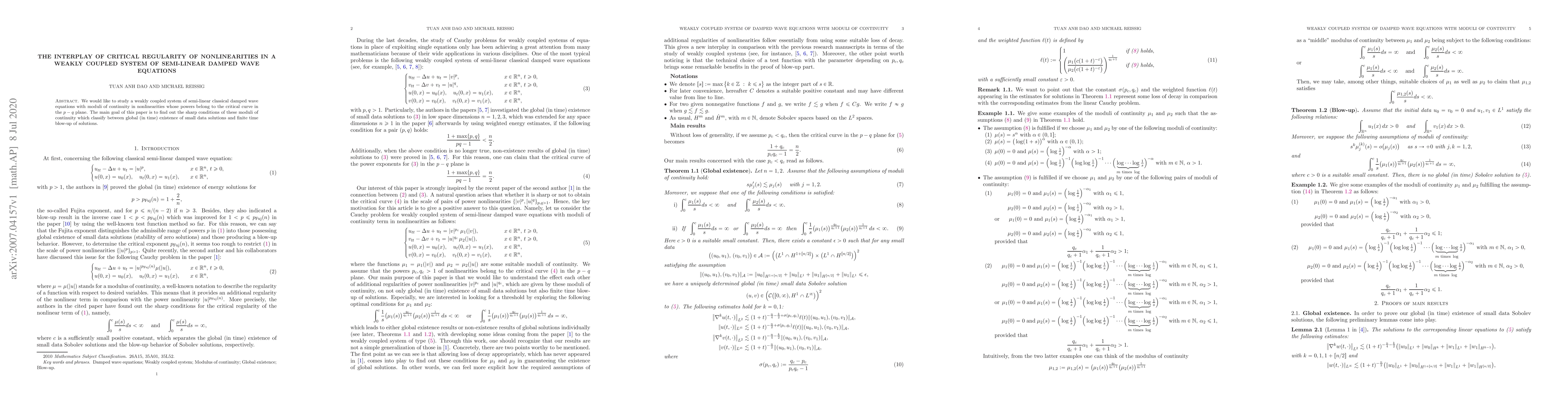 This paper investigates a weakly coupled system of semi-linear damped wave equations, focusing on the critical regularity of nonlinearities. The study aims to determine the precise conditions for moduli of continuity that distinguish between global existence and finite time blow-up of solutions.