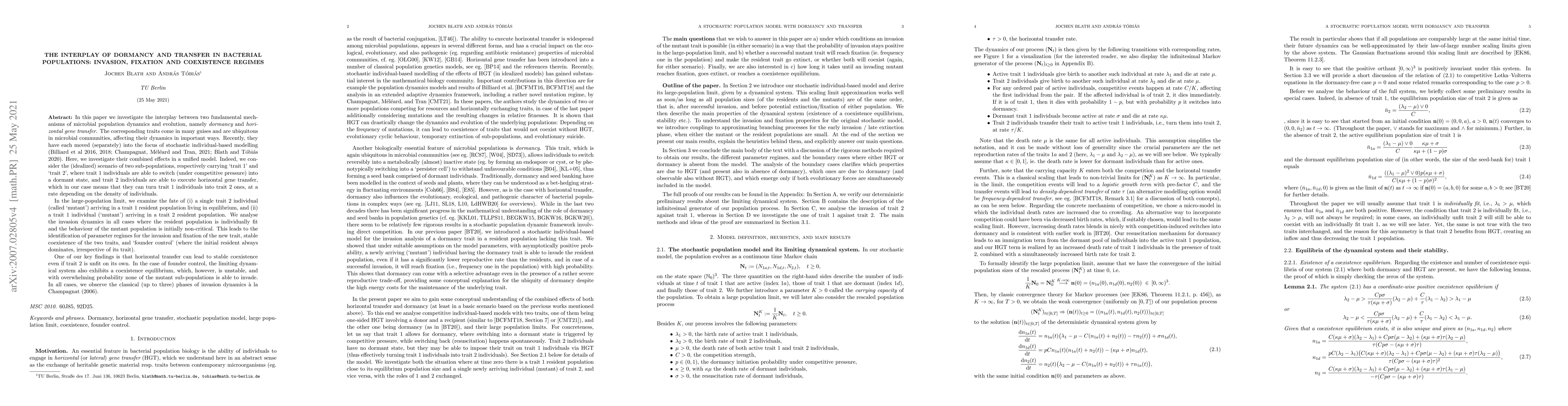 This paper explores the combined effects of dormancy and horizontal gene transfer in bacterial populations, identifying regimes for invasion, fixation, and coexistence of traits. It reveals that stable coexistence can occur even when one trait would be unfit on its own, highlighting complex dynamics in microbial population evolution.