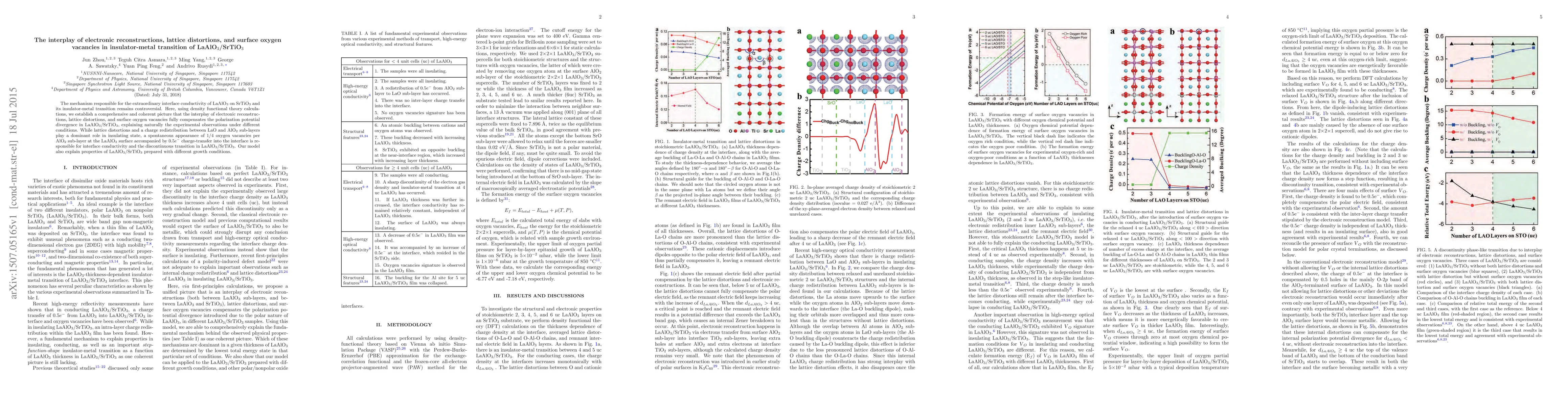 This paper uses density functional theory to elucidate the insulator-metal transition in LaAlO$_{3}$/SrTiO$_{3}$, attributing it to the interplay of electronic reconstructions, lattice distortions, and surface oxygen vacancies, which compensate for polarization potential divergence. The study reveals that oxygen vacancies and charge transfer drive the interface conductivity and transition.