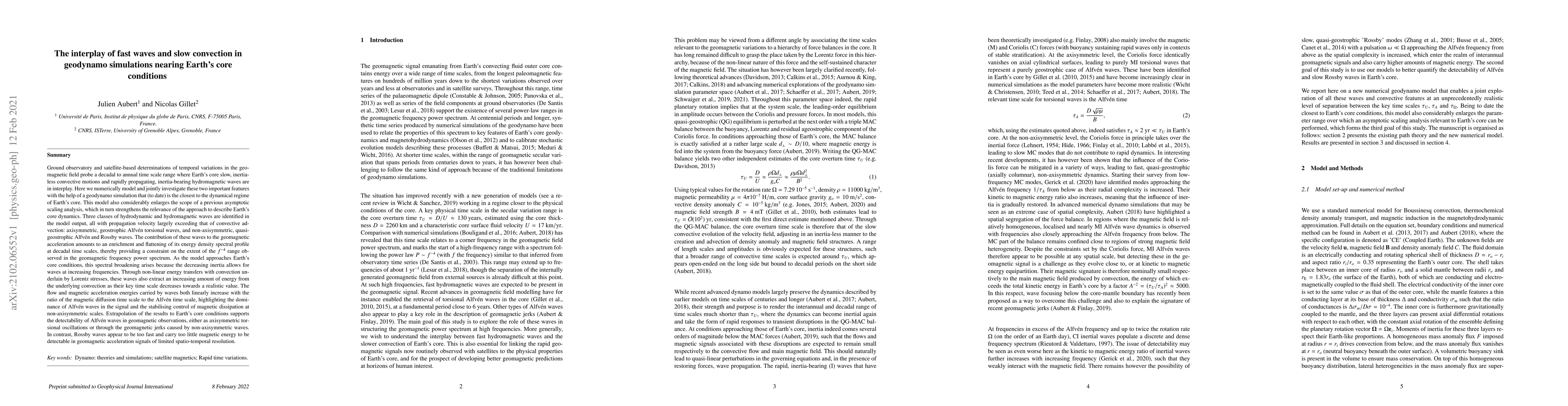 This research numerically models the interplay between Earth's core slow convection and fast hydromagnetic waves in a geodynamo simulation near Earth's core conditions. The study identifies three classes of waves, enriching the geomagnetic acceleration spectrum and suggesting Alfv\'en waves' detectability in geomagnetic observations.