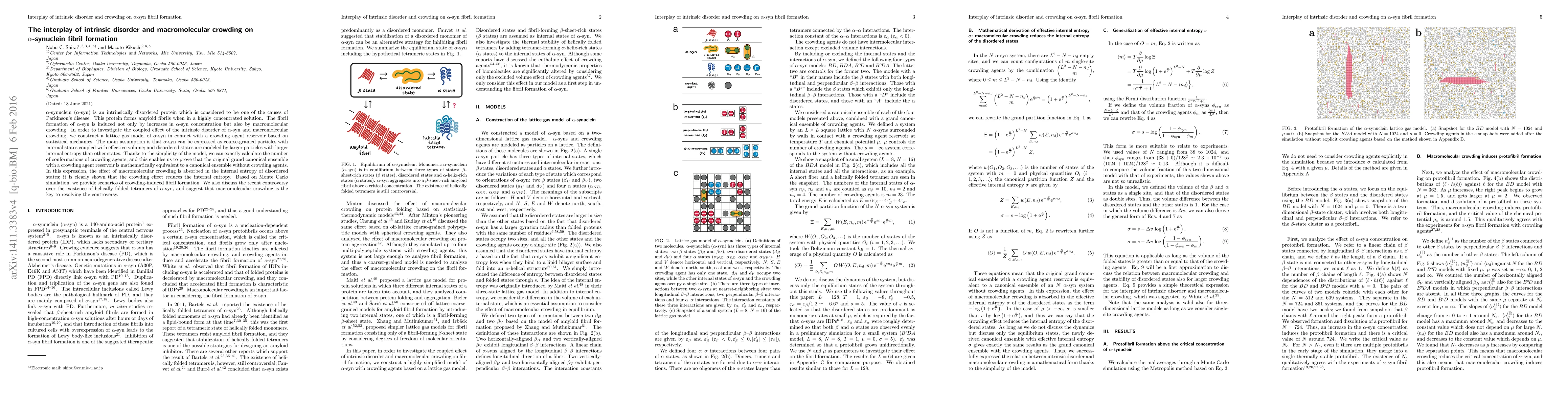 This paper investigates how intrinsic disorder in α-synuclein and macromolecular crowding influence its fibril formation, using a lattice gas model. The study reveals that crowding reduces the internal entropy of disordered states, thereby facilitating fibril formation, and suggests that crowding resolves the debate over helically folded tetramers of α-synuclein.