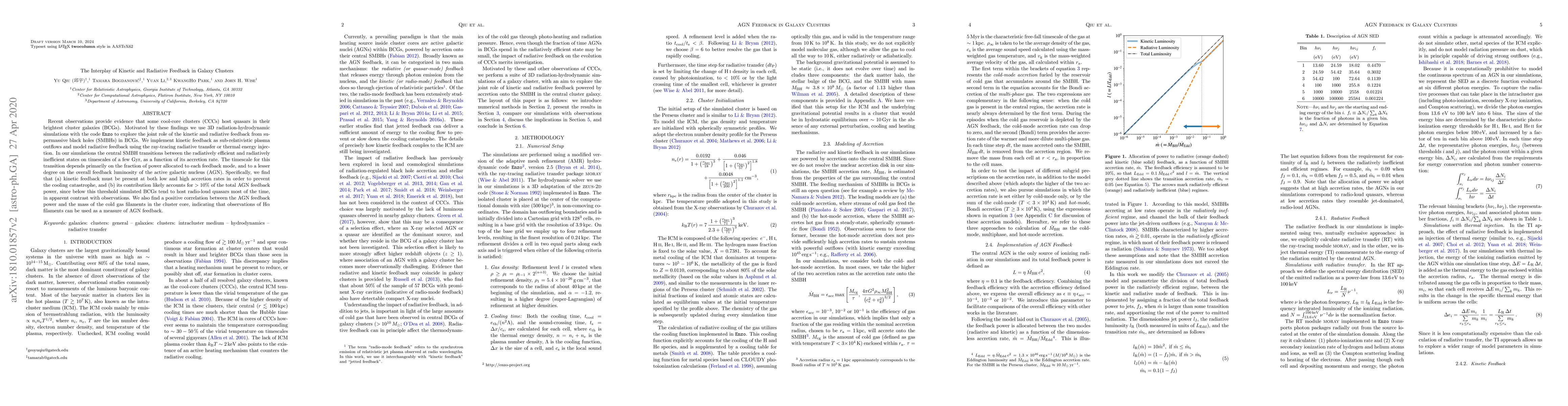 Recent observations provide evidence that some cool-core clusters (CCCs) host quasars in their brightest cluster galaxies (BCGs). Motivated by these findings we use 3D radiation-hydrodynamic simulations with the code Enzo to explore the joint role of the kinetic and radiative feedback from supermassive black holes (SMBHs) in BCGs. We implement kinetic feedback as sub-relativistic plasma outflows and model radiative feedback using the ray-tracing radiative transfer or thermal energy injection. In our simulations the central SMBH transitions between the radiatively efficient and radiatively inefficient states on timescales of a few Gyr, as a function of its accretion rate. The timescale for this transition depends primarily on the fraction of power allocated to each feedback mode, and to a lesser degree on the overall feedback luminosity of the active galactic nucleus (AGN). Specifically, we find that (a) kinetic feedback must be present at both low and high accretion rates in order to prevent the cooling catastrophe, and (b) its contribution likely accounts for > 10% of the total AGN feedback power, since below this threshold simulated BCGs tend to host radio-loud quasars most of the time, in apparent contrast with observations. We also find a positive correlation between the AGN feedback power and the mass of the cold gas filaments in the cluster core, indicating that observations of H$\alpha$ filaments can be used as a measure of AGN feedback.