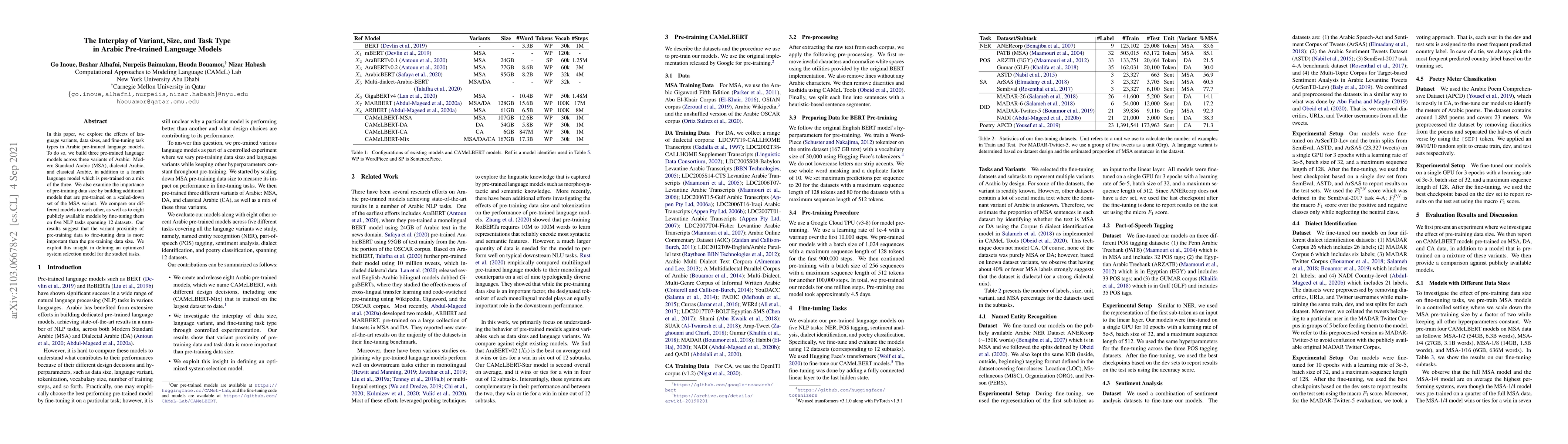 This paper investigates the impact of language variants, data sizes, and fine-tuning tasks on Arabic pre-trained language models. It constructs models for MSA, dialectal Arabic, classical Arabic, and a mixed variant, and evaluates their performance across various NLP tasks. Findings indicate that variant similarity is more crucial than data size, leading to an optimized model selection strategy.