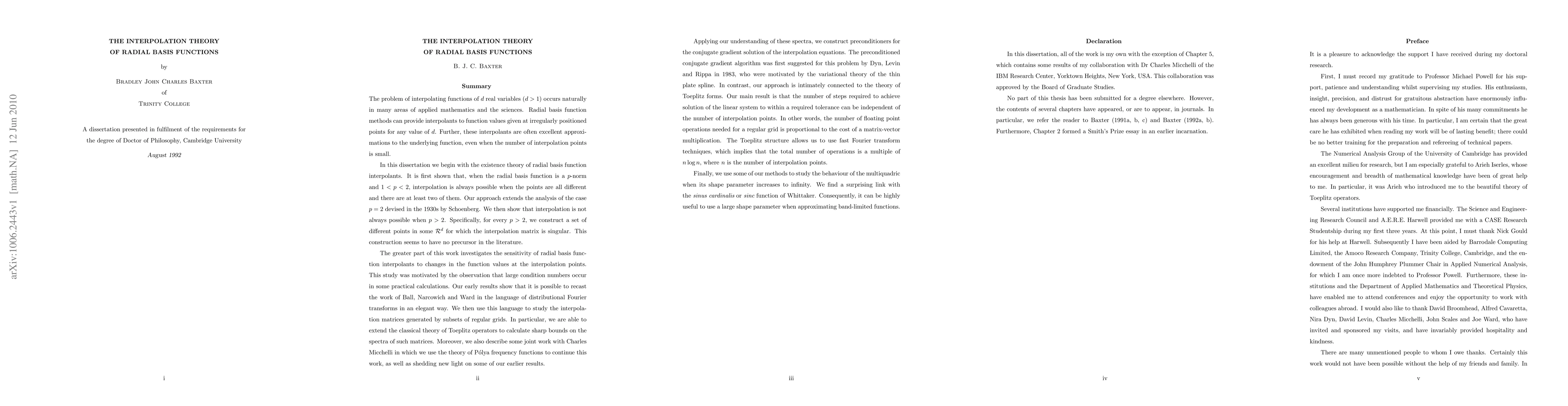 This paper explores the interpolation theory of radial basis functions, demonstrating that interpolation is possible for $1 < p < 2$ but not for $p > 2$. It investigates the sensitivity of radial basis function interpolants and constructs preconditioners that enable efficient solution of interpolation equations, leading to a computational complexity of $n \log n$.