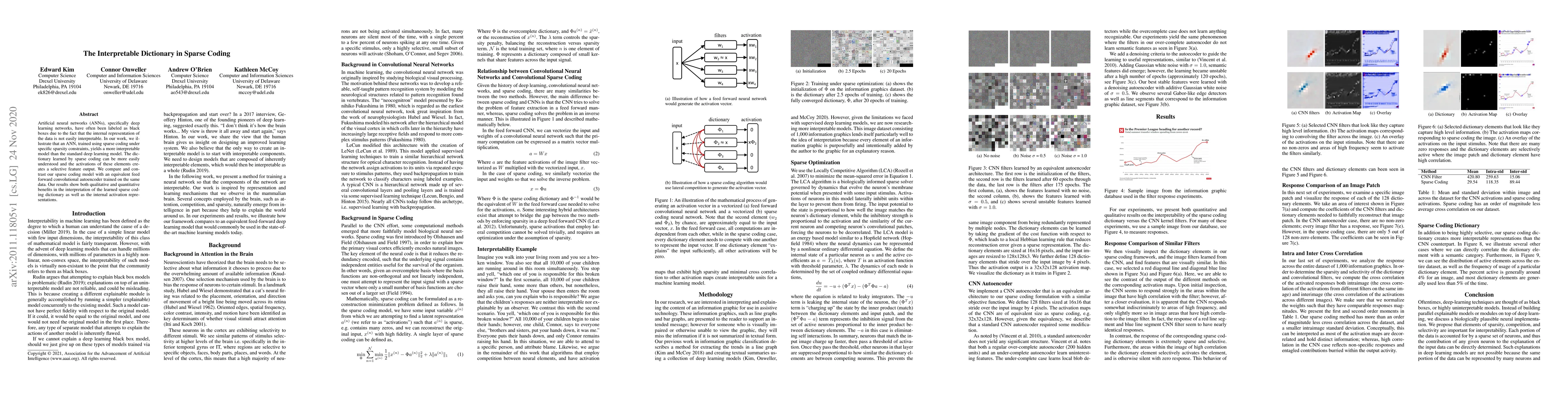 Artificial neural networks (ANNs), specifically deep learning networks, have often been labeled as black boxes due to the fact that the internal representation of the data is not easily interpretable. In our work, we illustrate that an ANN, trained using sparse coding under specific sparsity constraints, yields a more interpretable model than the standard deep learning model. The dictionary learned by sparse coding can be more easily understood and the activations of these elements creates a selective feature output. We compare and contrast our sparse coding model with an equivalent feed forward convolutional autoencoder trained on the same data. Our results show both qualitative and quantitative benefits in the interpretation of the learned sparse coding dictionary as well as the internal activation representations.