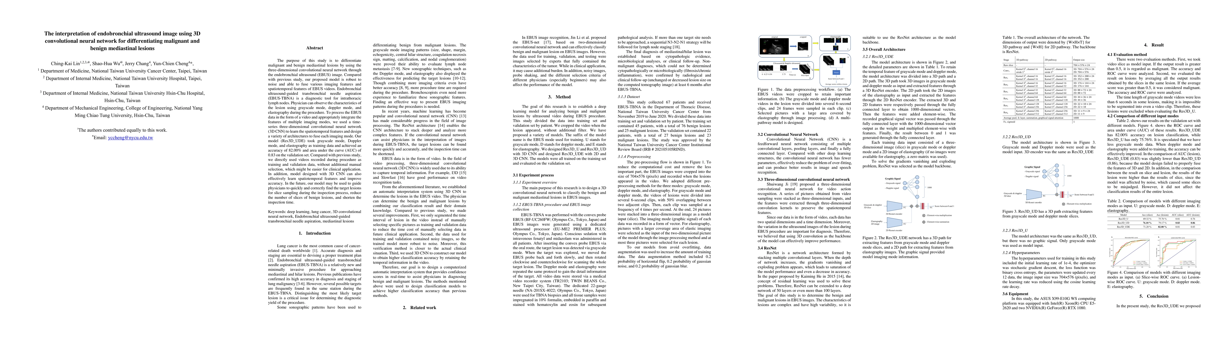 This study proposes a 3D convolutional neural network (3D CNN) to differentiate malignant and benign mediastinal lesions using endobronchial ultrasound (EBUS) images. The model, Res3D_UDE, integrates grayscale, Doppler, and elastography data from EBUS videos to achieve 82.00% accuracy and an AUC of 0.83, demonstrating robustness and potential for clinical use by reducing inspection time and unnecessary sampling.