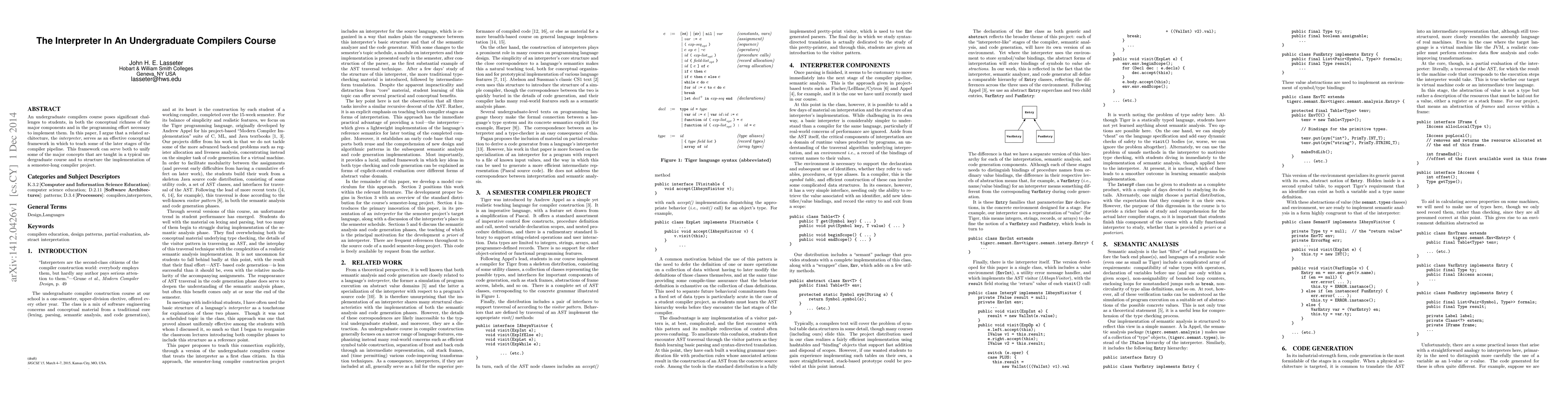 This paper argues that using an interpreter as a conceptual framework in an undergraduate compilers course can effectively unify major concepts and structure the implementation of a semester-long compiler project, addressing the challenges posed by the complexity of the compiler pipeline.