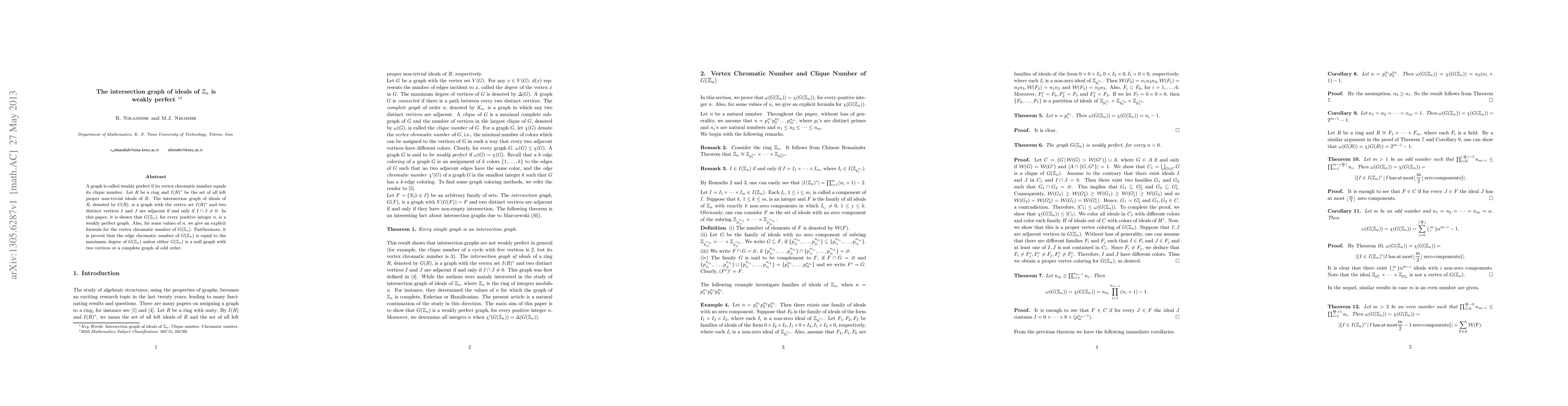 This paper proves that the intersection graph of ideals of $\mathbb{Z}_n$, denoted $G(\mathbb{Z}_n)$, is weakly perfect, meaning its vertex chromatic number equals its clique number, and provides explicit formulas for its vertex chromatic number for specific $n$.