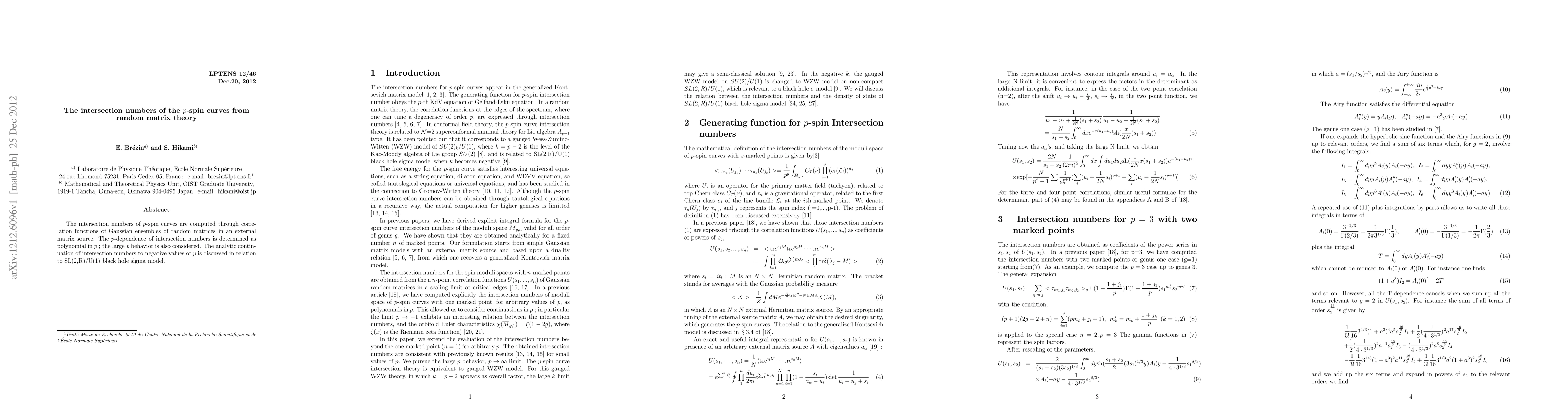 This paper computes the intersection numbers of p-spin curves using correlation functions from Gaussian ensembles of random matrices, revealing a p-dependent polynomial behavior and discussing their analytic continuation to negative p values in the context of the SL(2,R)/U(1) black hole sigma model.