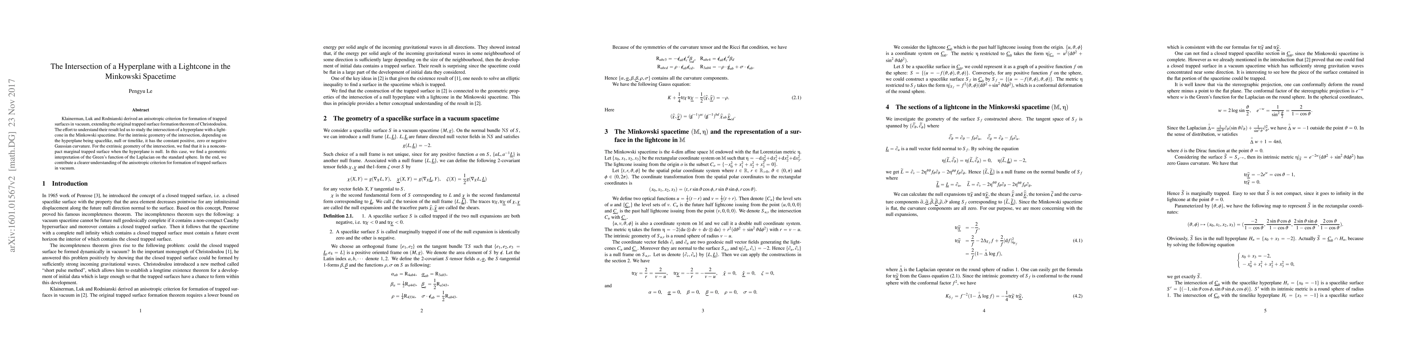 Klainerman, Luk and Rodnianski derived an anisotropic criterion for formation of trapped surfaces in vacuum, extending the original trapped surface formation theorem of Christodoulou. The effort to understand their result led us to study the intersection of a hyperplane with a lightcone in the Minkowski spacetime. For the intrinsic geometry of the intersection, depending on the hyperplane being spacelike, null or timelike, it has the constant positive, zero or negative Gaussian curvature. For the extrinsic geometry of the intersection, we find that it is a noncompact marginal trapped surface when the hyperplane is null. In this case, we find a geometric interpretation of the Green's function of the Laplacian on the standard sphere. In the end, we contribute a clearer understanding of the anisotropic criterion for formation of trapped surfaces in vacuum.