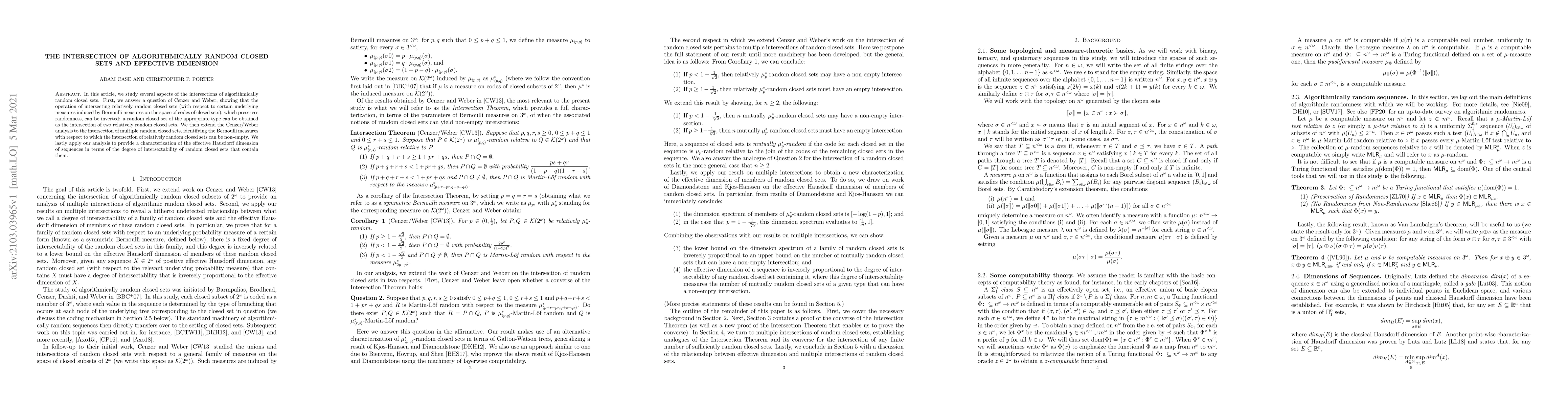This paper investigates the intersection properties of algorithmically random closed sets, demonstrating that the intersection of relatively random closed sets can be inverted to obtain a random closed set. It extends this analysis to multiple intersections and connects the results to the effective Hausdorff dimension of sequences.