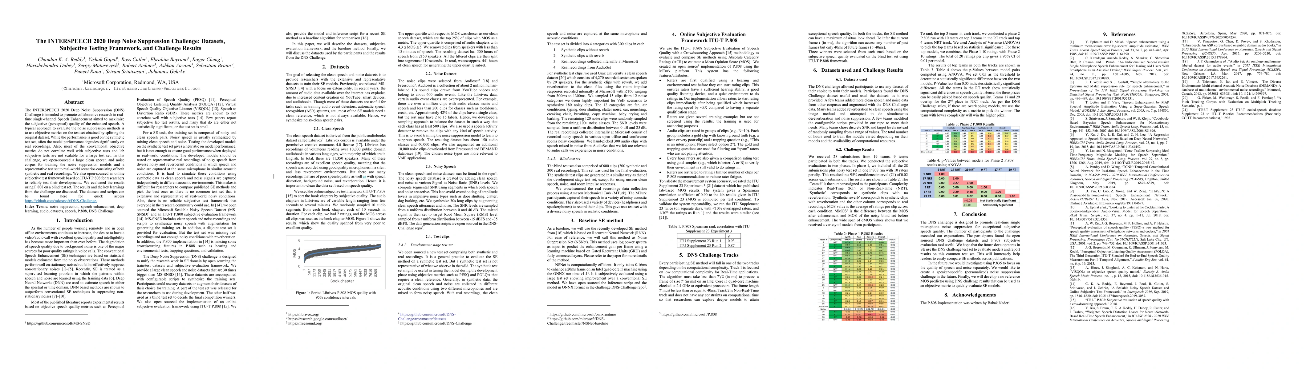 The INTERSPEECH 2020 Deep Noise Suppression Challenge introduced a large dataset and an online subjective testing framework to improve real-time single-channel speech enhancement, emphasizing perceptual quality. Results from the challenge highlighted the importance of using both synthetic and real-world recordings for training and testing noise suppression models.