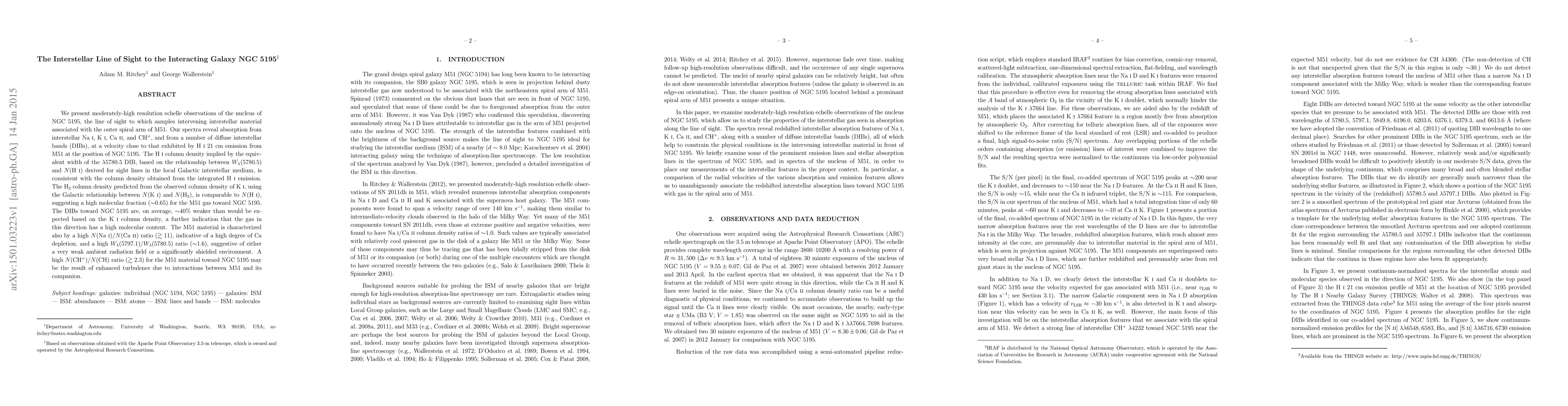 This paper analyzes high-resolution spectra of NGC 5195, revealing significant interstellar absorption lines indicative of high molecular content and complex chemical processes, including high depletion of calcium and enhanced turbulence due to galaxy interactions.