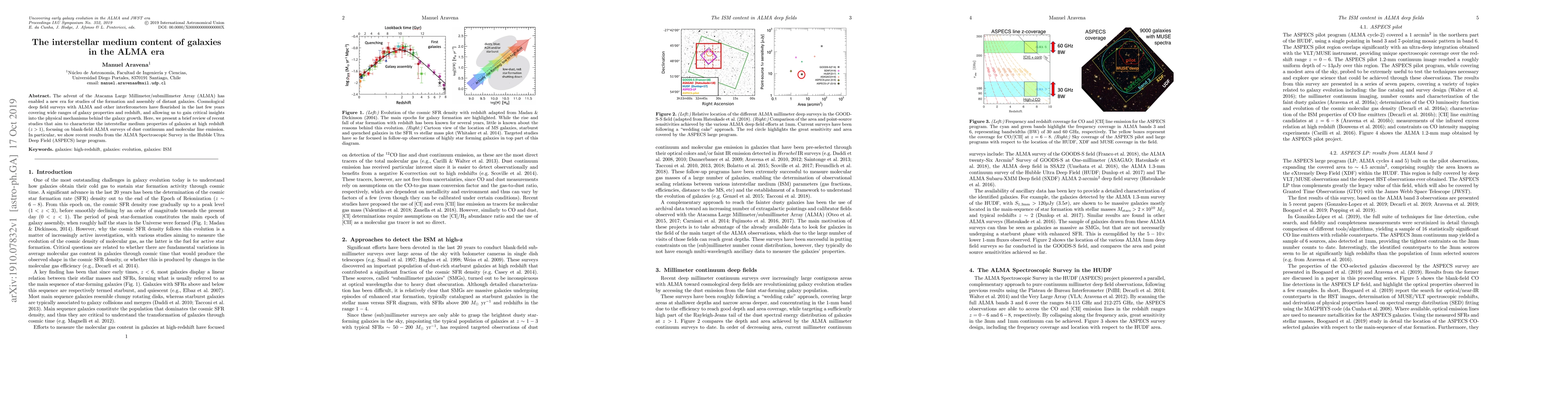 This paper reviews recent ALMA-based studies characterizing the interstellar medium of high-redshift galaxies, emphasizing dust continuum and molecular line emissions from the ASPECS survey in the Hubble Ultra Deep Field. These findings provide critical insights into the physical mechanisms driving galaxy growth.