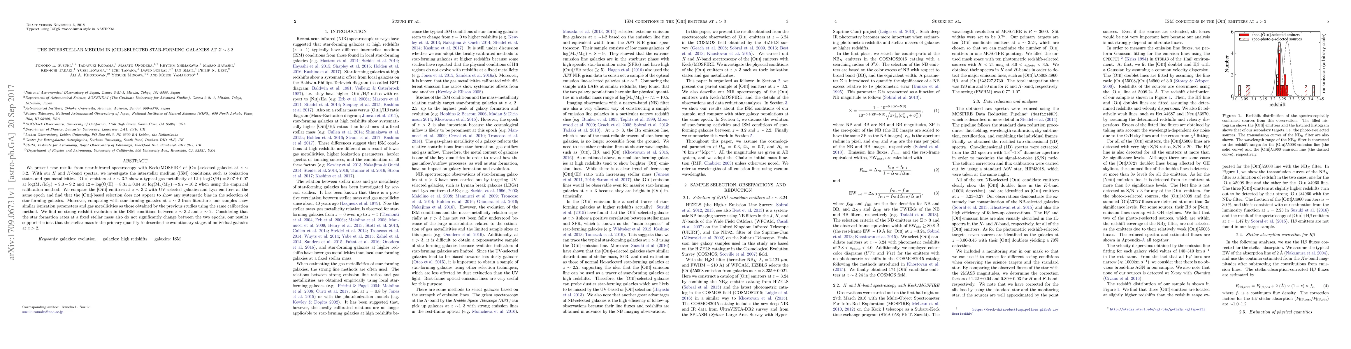 We present new results from near-infrared spectroscopy with Keck/MOSFIRE of [OIII]-selected galaxies at $z\sim3.2$. With our $H$ and $K$-band spectra, we investigate the interstellar medium (ISM) conditions, such as ionization states and gas metallicities. [OIII] emitters at $z\sim3.2$ show a typical gas metallicity of $\mathrm{12+log(O/H) = 8.07\pm0.07}$ at $\mathrm{log(M_*/M_\odot) \sim 9.0-9.2}$ and $\mathrm{12+log(O/H) = 8.31\pm0.04}$ at $\mathrm{log(M_*/M_\odot) \sim 9.7-10.2}$ when using the empirical calibration method. We compare the [OIII] emitters at $z\sim3.2$ with UV-selected galaxies and Ly$\alpha$ emitters at the same epoch and find that the [OIII]-based selection does not appear to show any systematic bias in the selection of star-forming galaxies. Moreover, comparing with star-forming galaxies at $z\sim2$ from literature, our samples show similar ionization parameters and gas metallicities as those obtained by the previous studies using the same calibration method. We find no strong redshift evolution in the ISM conditions between $z\sim3.2$ and $z\sim2$. Considering that the star formation rates at a fixed stellar mass also do not significantly change between the two epochs, our results support the idea that the stellar mass is the primary quantity to describe the evolutionary stages of individual galaxies at $z>2$.